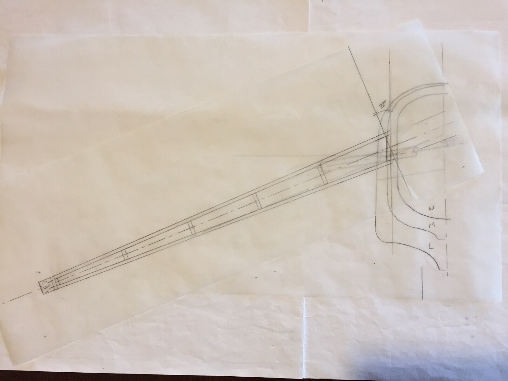 Tout ces angles mis bout à bout, desaxé deux fois ça donne un mouvement bizzare du stab (je pense elliptique) et comme la nervure d'emplanture est plutôt longue ces defauts deviennent trop important (pour moi). Mais ce qui me fait vraiment peur est ce mouvement, qui me fait penser que la corde moyenne (incidence) ne travaille pas dans l'axe et risque de creer comme un vrillage de stab qui s'accentue avec la rotation. Sur une photo on voit bien le deport que fait la nervure (par rapport au fuselage) en montant et c'est le contraire en descendant c'est à dire qu'elle rentre dans le fuselage. Je vais donc reprendre la planche a dessin, enlever tout ce que j ai fait, et repenser la meilleure facon de faire ces stab et surtout de fixer tout ça maintenant que les couples sont deja collés, la derive en place etc....bref gros coup de frein sur le projet. Photos