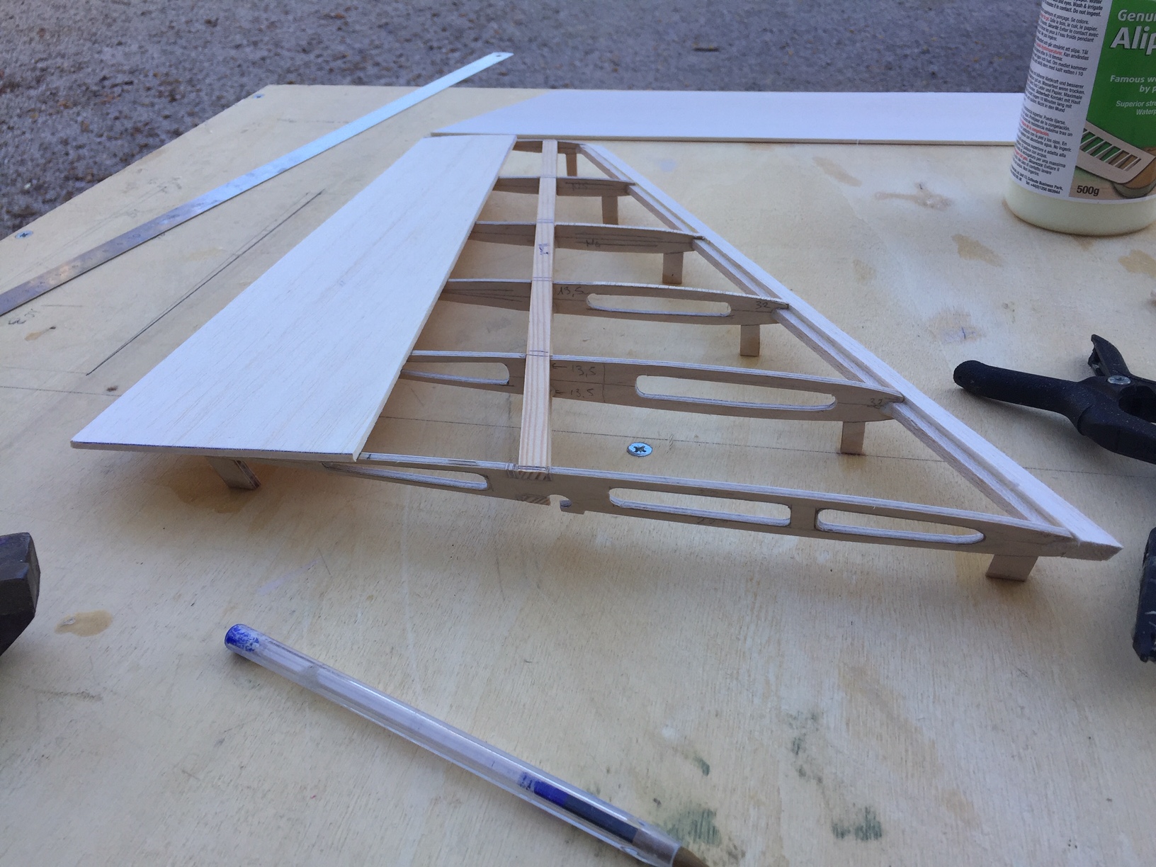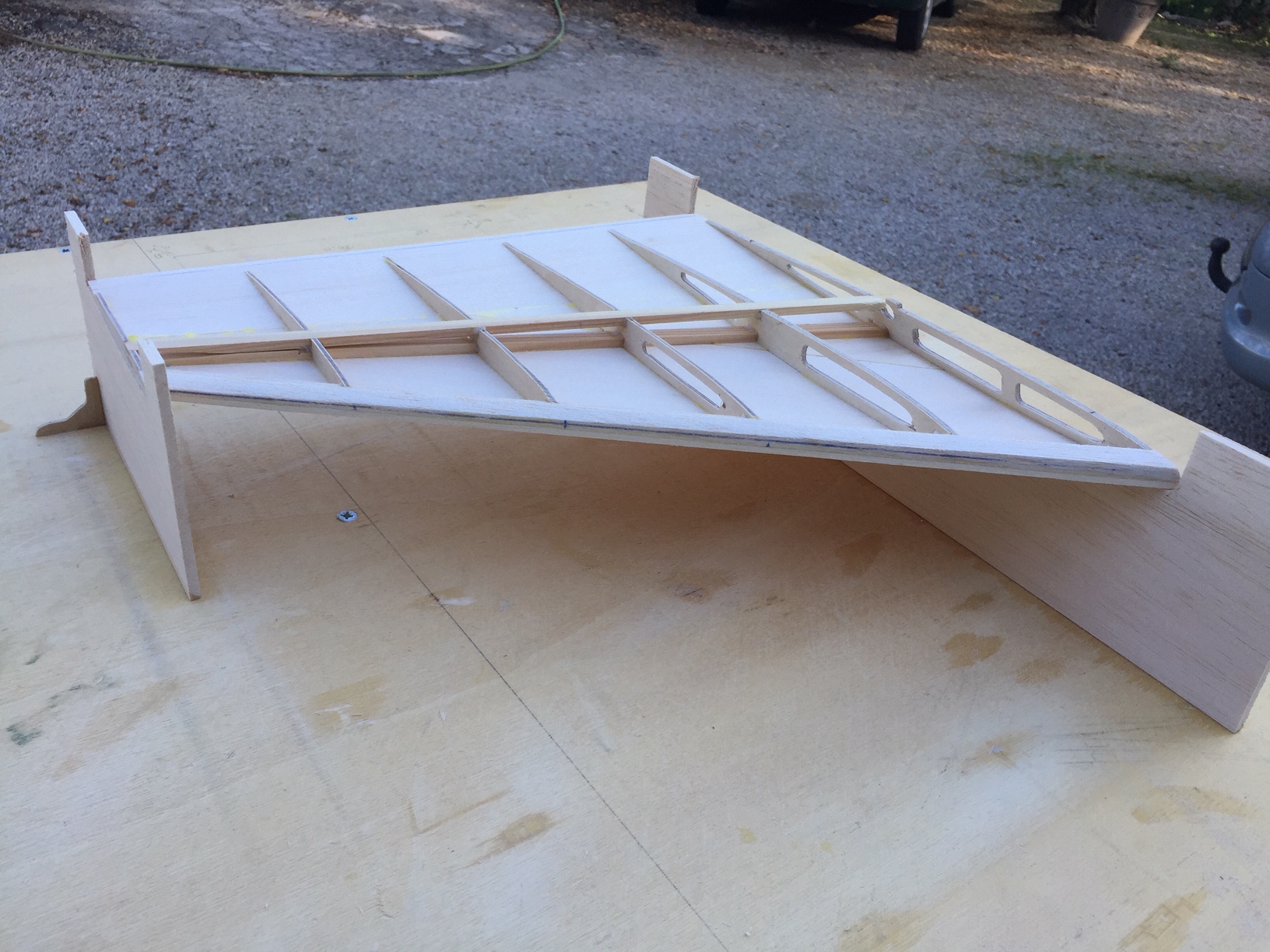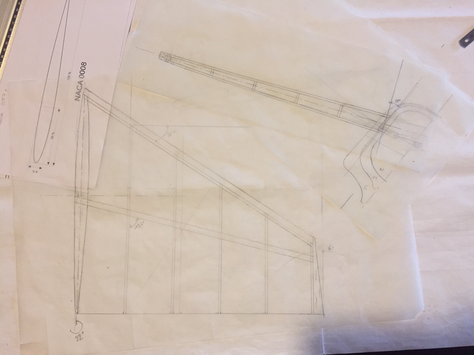 Bonjour à tous, la dérive est collée et j'ai commencé le coffrage de la partie arrière. En même temps j'ai commencé les plans des stab, j'ai utilsé un naca 0007 (0008 à l'origine étiré à 7%) et j'ai rogné sur le "compromis" de départ, je me suis finalement rapproché des dimensions maquette. Photos
