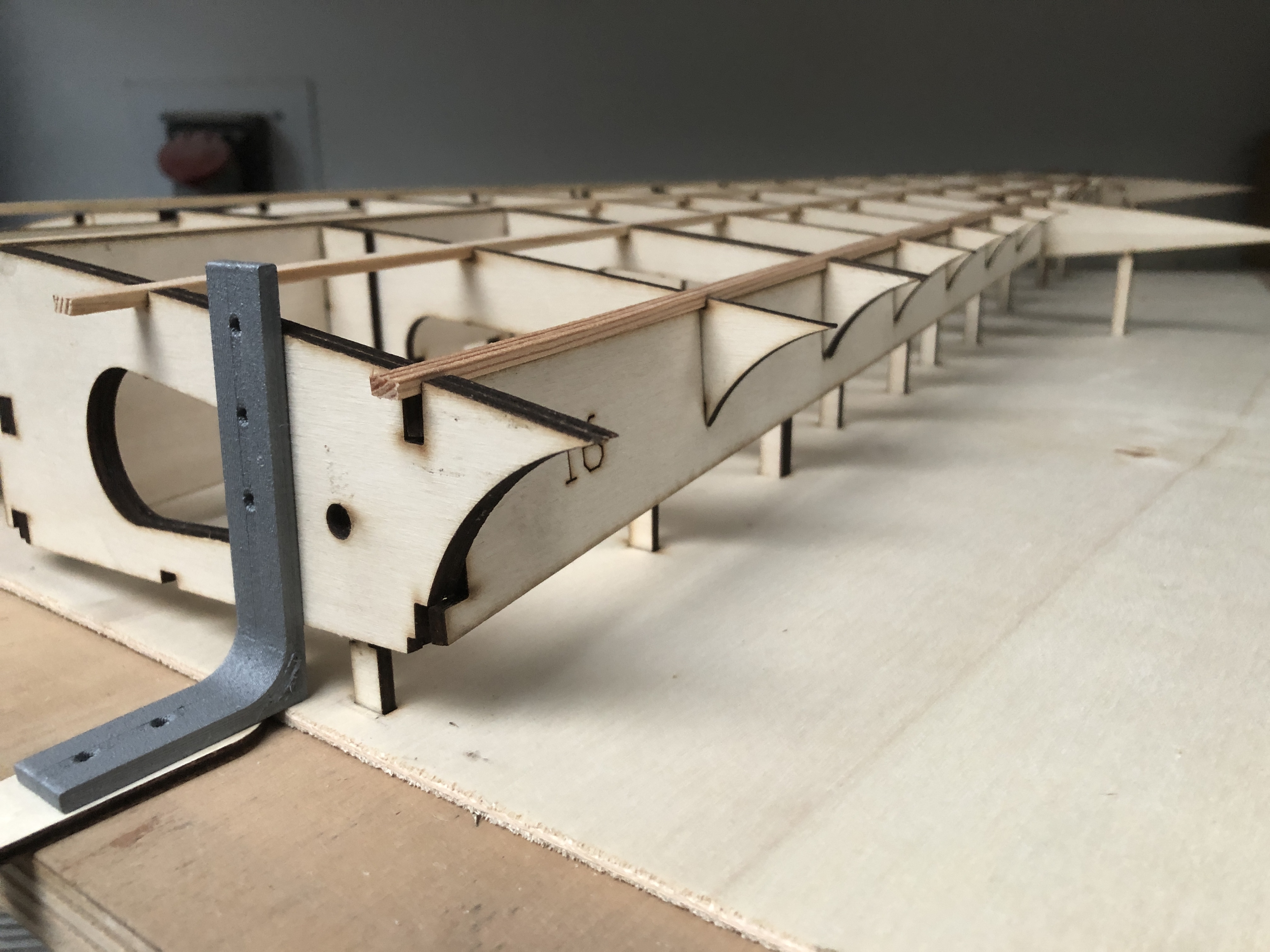 Première découpe de test du stabilisateur - Pour le test toutes les nervures sont découpées laser comme le chantier, dans du contre plaqué de peuplier – ça se présente très bien pour le stabilisateur. Chaque talon de nervure est à sa place et ça s’emboite parfaitement (en fonction des tolérances d’épaisseur du bois, il y aura peut-être un ou deux dixième à toiler pour que ça s'emboite toujours aussi bien... mais rien d’extraordinaire..) – Tout est bien aligné.