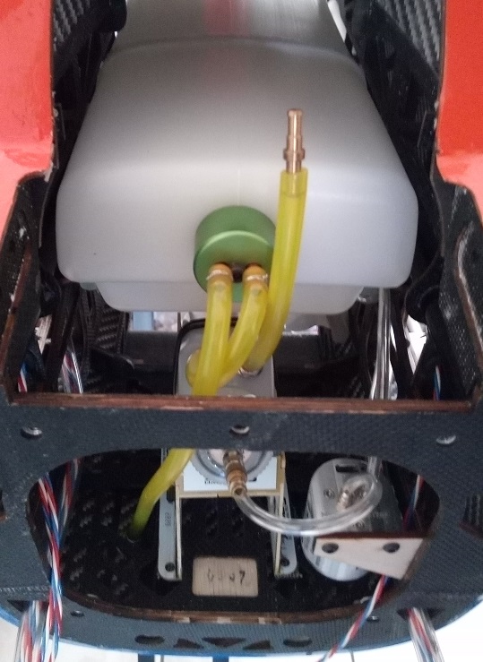 Le réservoir est bridé par 3 colliers rilsan sur sa platine : un des 3 s'est cassé lors du serrage : Avec 2 ça tient suffisamment pour les essais sol . je rajouterai le 3ème dès que possible. en longitudinal le réservoir vient en appui sur la trappe réacteur.