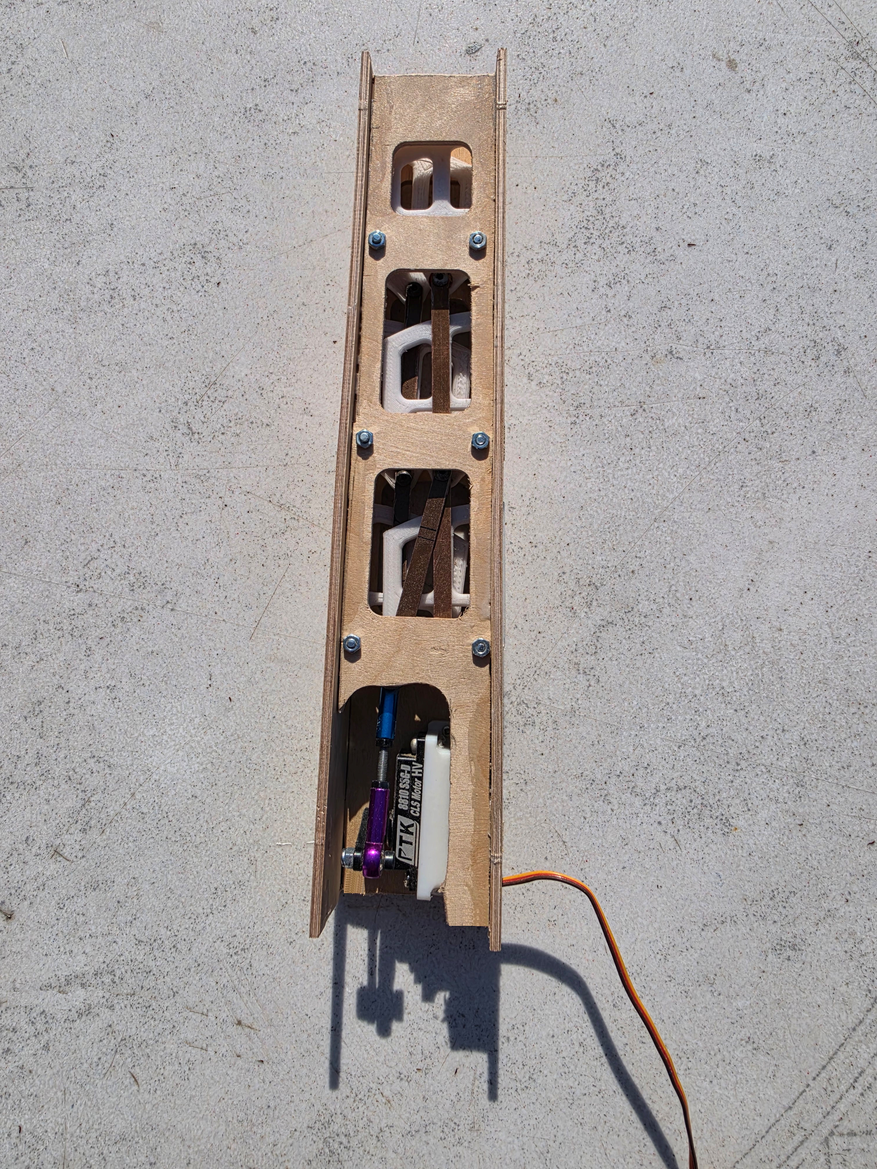 Mais le premier travail consiste à réaliser les pièces de la mécanique des aérofreins. Ils sont constitués chacun de 3 palettes pour l extrados et 3 palettes pour l intrados. Un servo équipé d un palonnier avec un débattement d environ 25 mm permet de sortir et de renter complètement les palettes. Les palettes sont réalisées a l aide d une imprimante 3D avec un PETG, les flancs a partir de ctp bouleau 30/10.