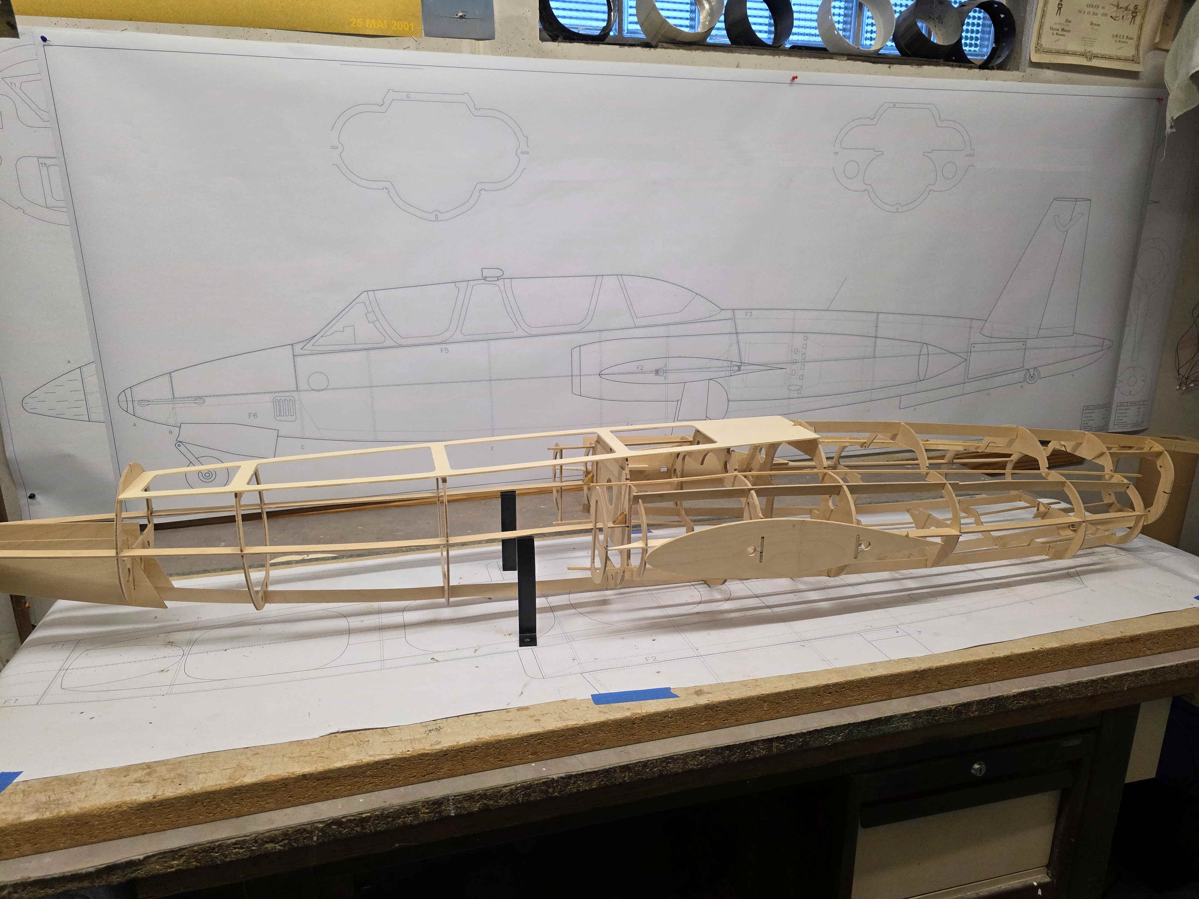 C est un modèle que je souhaitai construire depuis de nombreuses années, mais toujours repoussé par d autres priorités. Les premiers traits sont tirés début janvier, puis apres plusieurs épures, début février les grandes lignes de ce nouveau projet sont enfin figées. L’échelle au ¼ conduit a une longueur d’environ 2.45m une envergure de 3 m pour une surface alaire de 108 dm². Pour faciliter son transport la partie arrière du fuselage est amovible au niveau des sorties des tuyères. Les ailes viennent se plaquer de part et d autre du fuselage ainsi que les stabs. L ossature du fuselage se compose de 17 cadres dont 13 en ctp de 30/10 et 4 en ctp de 50/10, chaque cadre est positionné par des lisses entaillées également en ctp de 30/10. Derrière le cockpit un grand capot permet l accès au réacteur ainsi qu’à la tuyère. Les deux cadres en ctp de 50/10 supportent les ferrures d ailes, les deux autres assurent la liaison avec la partie arrière.