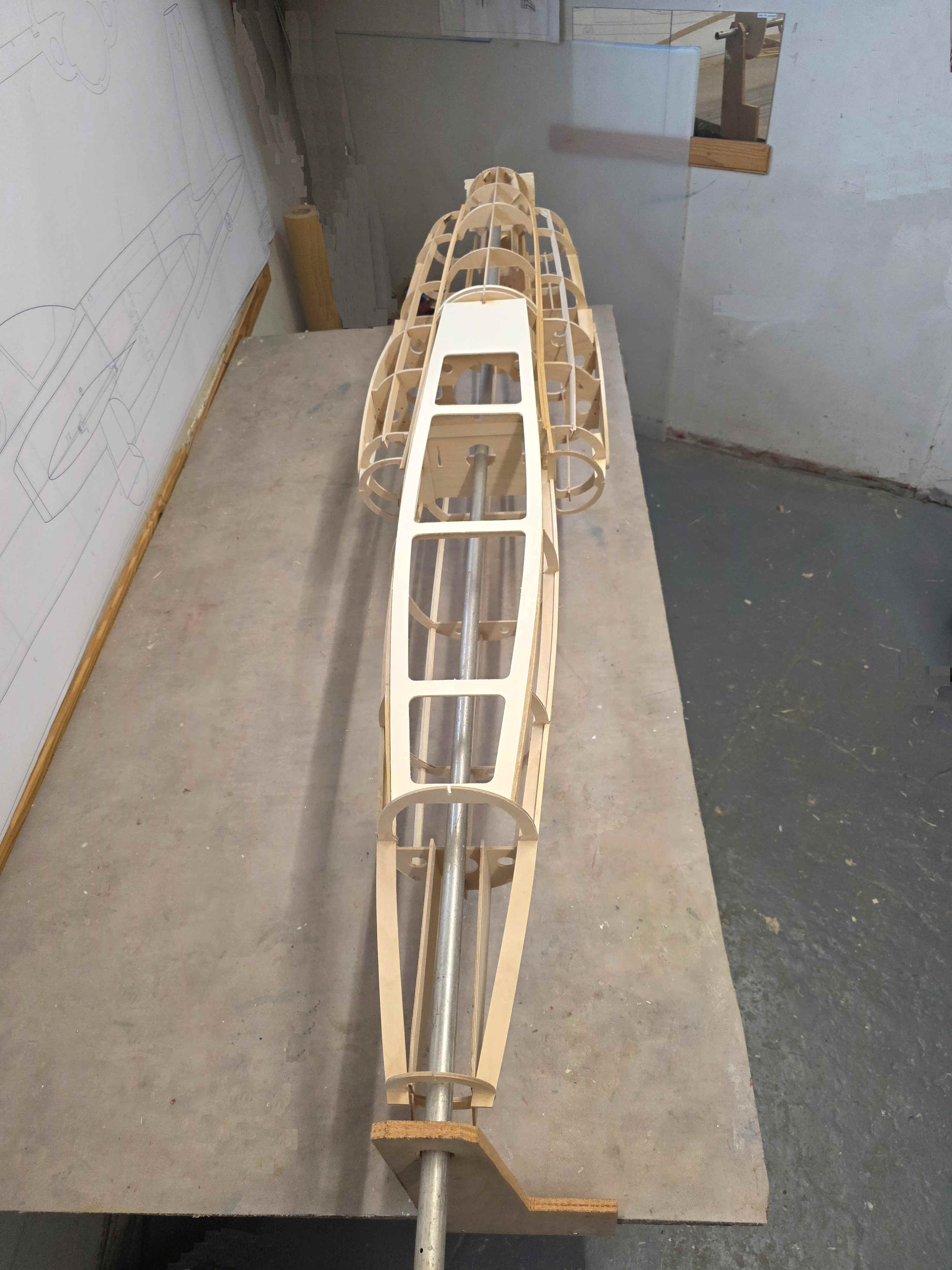 C est un modèle que je souhaitai construire depuis de nombreuses années, mais toujours repoussé par d autres priorités. Les premiers traits sont tirés début janvier, puis apres plusieurs épures, début février les grandes lignes de ce nouveau projet sont enfin figées. L’échelle au ¼ conduit a une longueur d’environ 2.45m une envergure de 3 m pour une surface alaire de 108 dm². Pour faciliter son transport la partie arrière du fuselage est amovible au niveau des sorties des tuyères. Les ailes viennent se plaquer de part et d autre du fuselage ainsi que les stabs. L ossature du fuselage se compose de 17 cadres dont 13 en ctp de 30/10 et 4 en ctp de 50/10, chaque cadre est positionné par des lisses entaillées également en ctp de 30/10. Derrière le cockpit un grand capot permet l accès au réacteur ainsi qu’à la tuyère. Les deux cadres en ctp de 50/10 supportent les ferrures d ailes, les deux autres assurent la liaison avec la partie arrière.