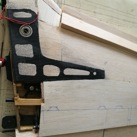 Au niveau du point de pivot, j'ai pris en sandwich par 2 plaques carbone en L, ajouré pour le poids ! ( j'ai essayé de gagner du poids partout, mais la faire des ouvertures pour gagner 5 gr environ est complètement débile de ma part)