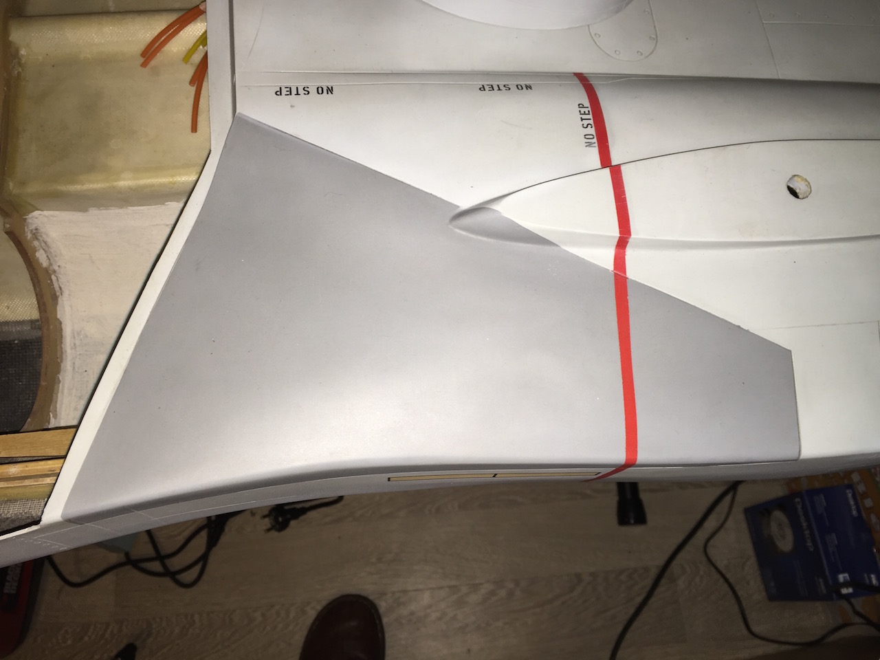 matériel très fiable : la peinture des ailles ,ailerons et dérives est enfin terminé . mise en peinture du nez qui recevra batteries ,affichage Powerbox , prises rapides fluide etc... et pour terminer je commence le masquage et ponçage de la partie sous le rabattement d'ailes pour peinture en "gris technique" commence a devenir black mais pas encore bunny