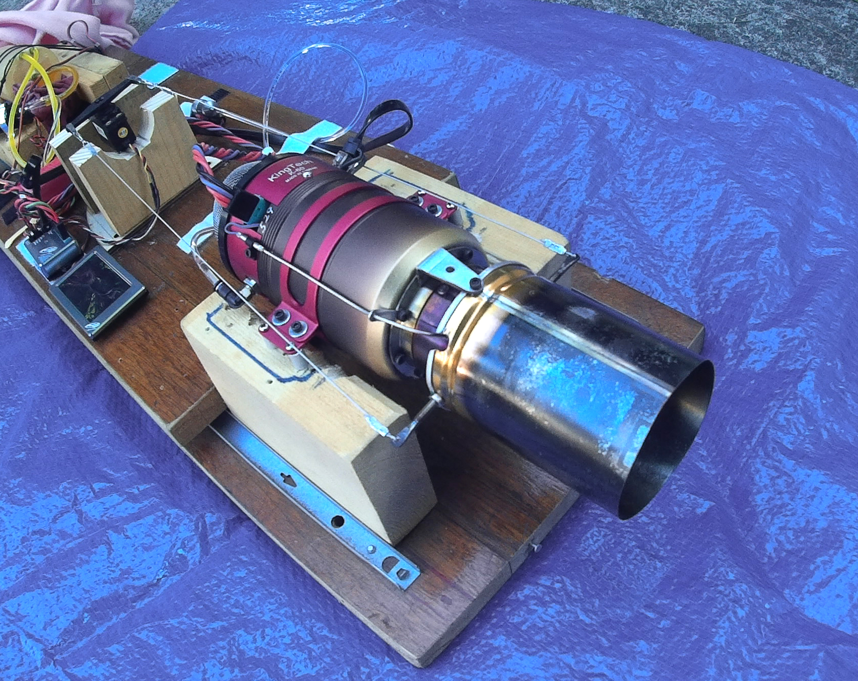 Désirant un système de poussée vectorielle en lacet le plus simple et léger possible j´en suis arrivé a le fixer directement sur le réacteur. C´est peut être pas académique, mais il fonctionne bien.
