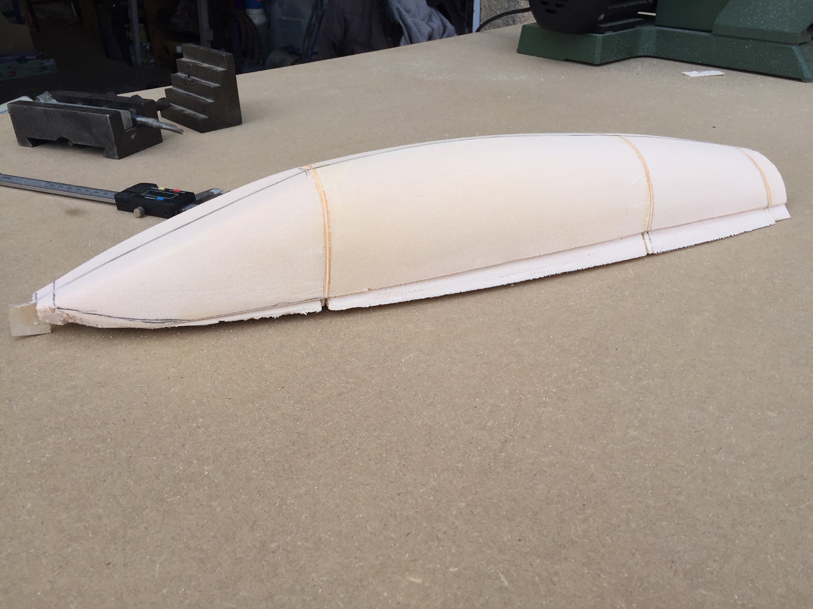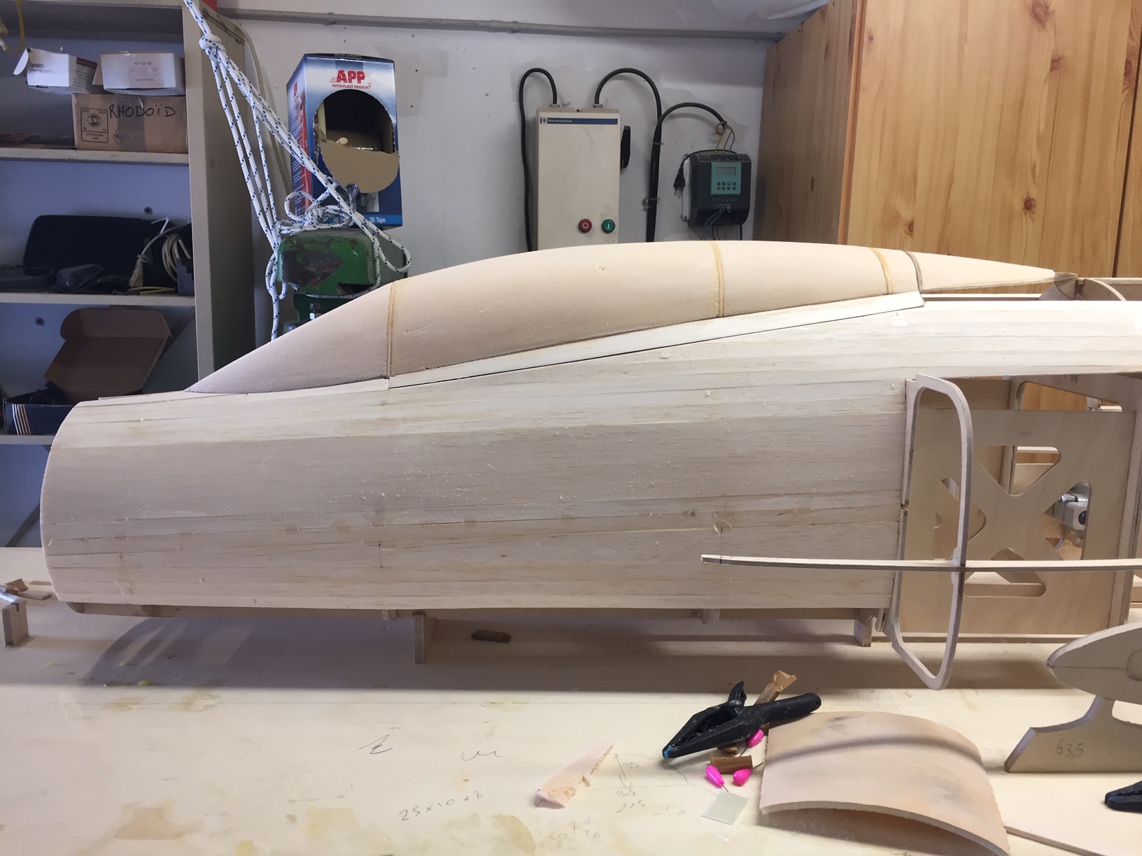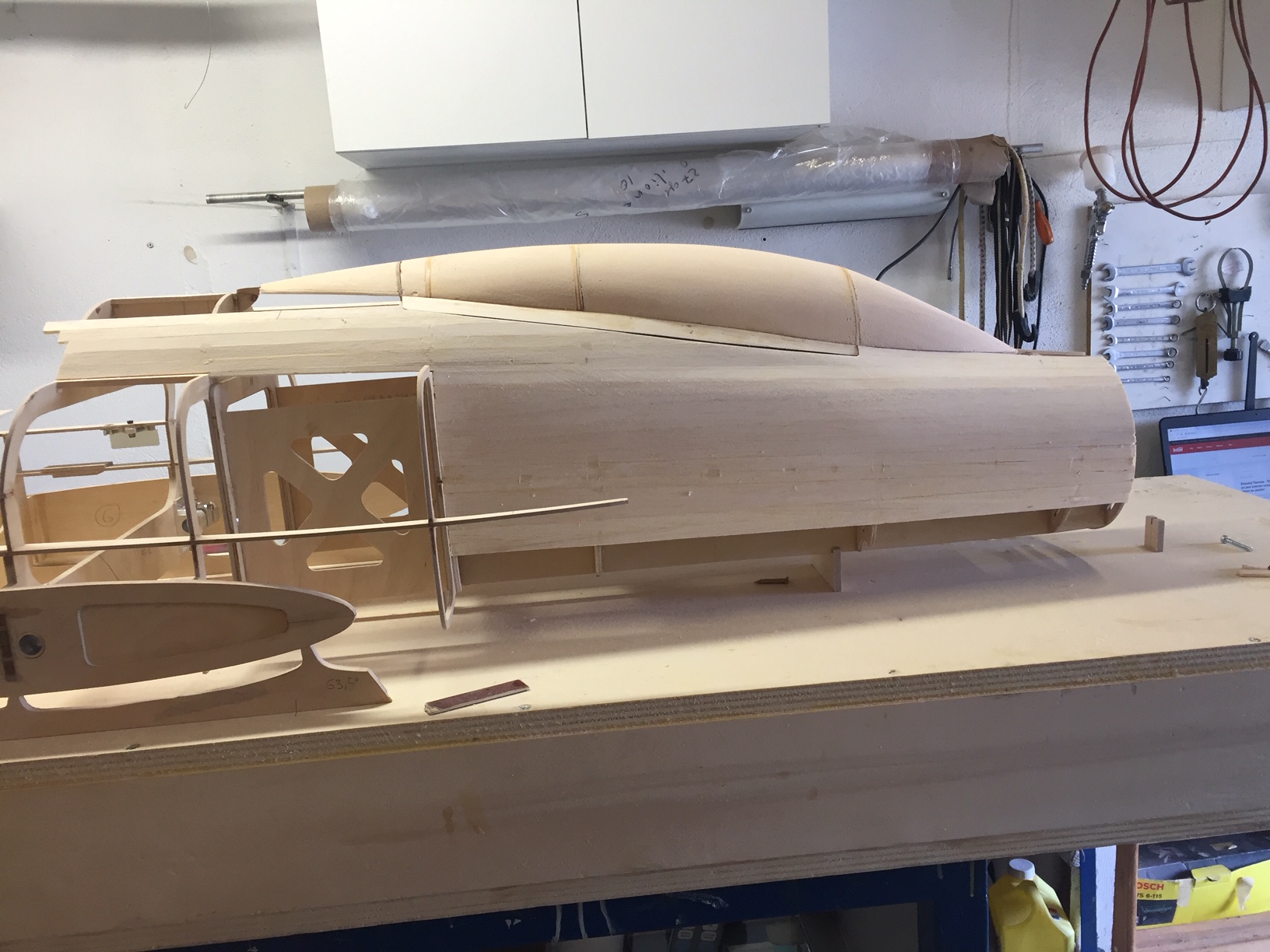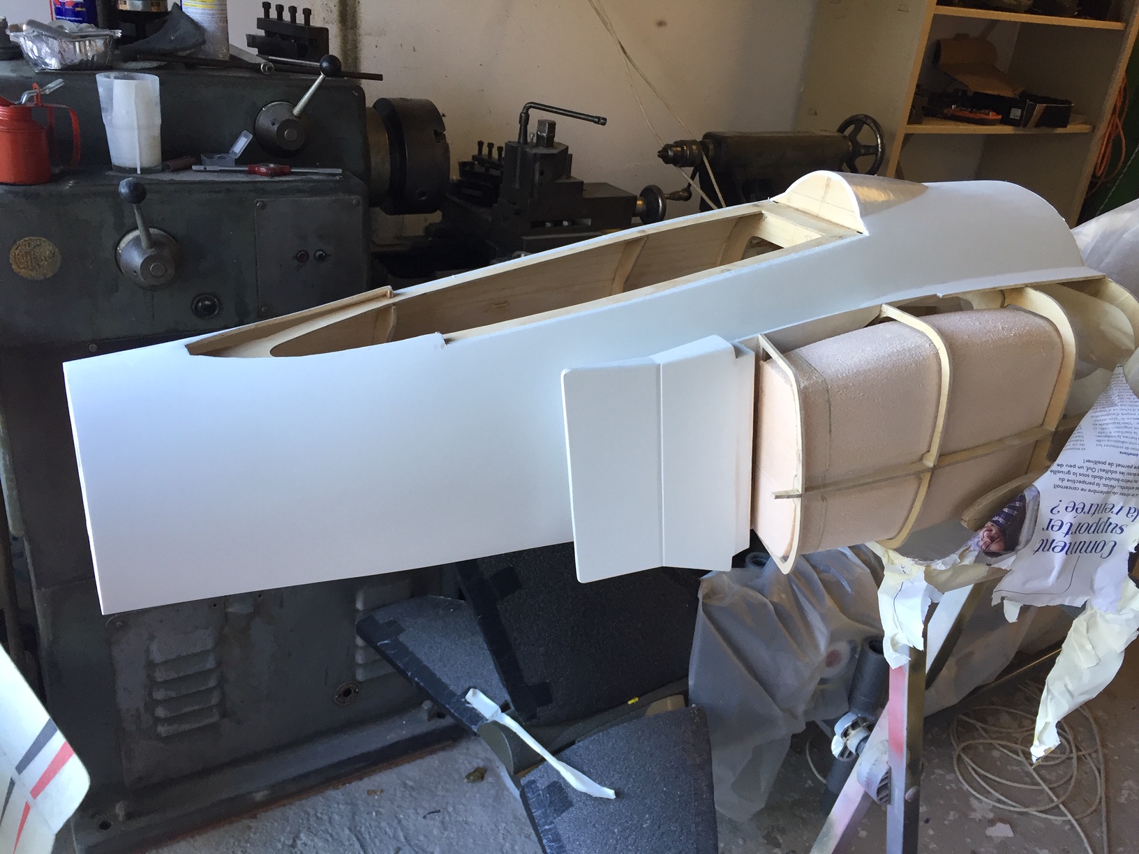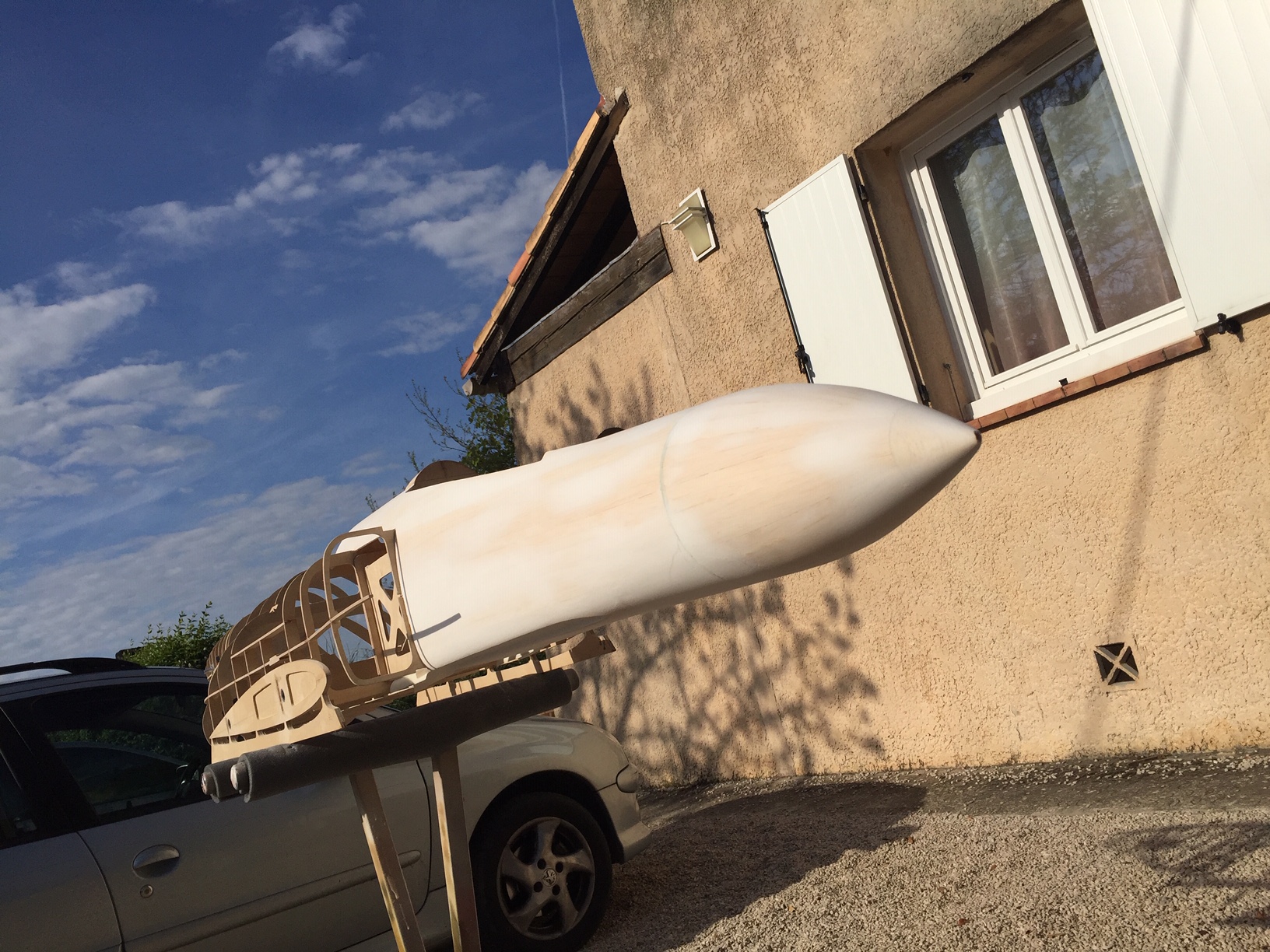 Bonjour à tous, fin de l'ébauche de la verriere, il restera à fibrer, mastiquer, et aprêt carrossier (avec poncage entre chaque etape evidement). La partie avant sera integrée au fuselage (comme le bossage arriere) et pour l'ouverture je ne suis pas encore décidé. Le but etait de voir si elle allait bien s intégrer avec le fuselage, ce qui semble bon. Prochaine etape le coffrage de la partie avant, puis fibrage partiel pour enfin s attaquer aux entrées d air. Photos