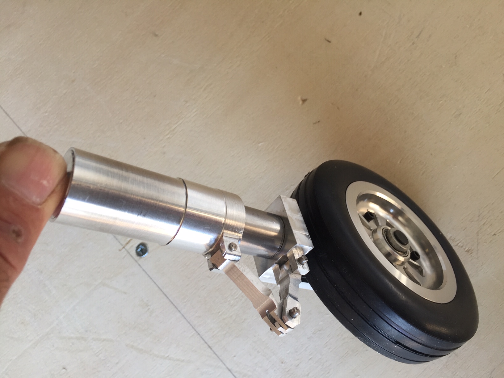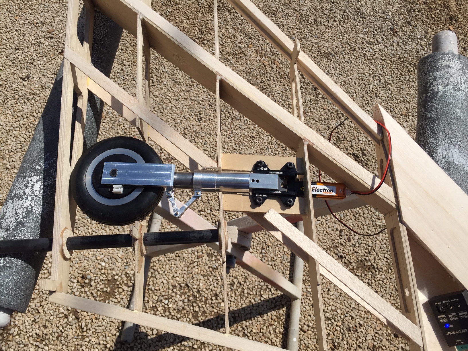 J ai fait un systeme avec un amortissement hydraulique (tres simple) recuperé sur un amortisseur de voiture 1/10 (je crois). Je ferai un post sur sa construction lorsque que je ferai la deuxieme jambe (ca peux peut etre interresser certains d entre nous). La difficulté à été de faire rentrer tout ca dans l epaisseur de l aile, mais ca passe, je pourrais meme faire les trappes sans que rien ne depasse. Photos