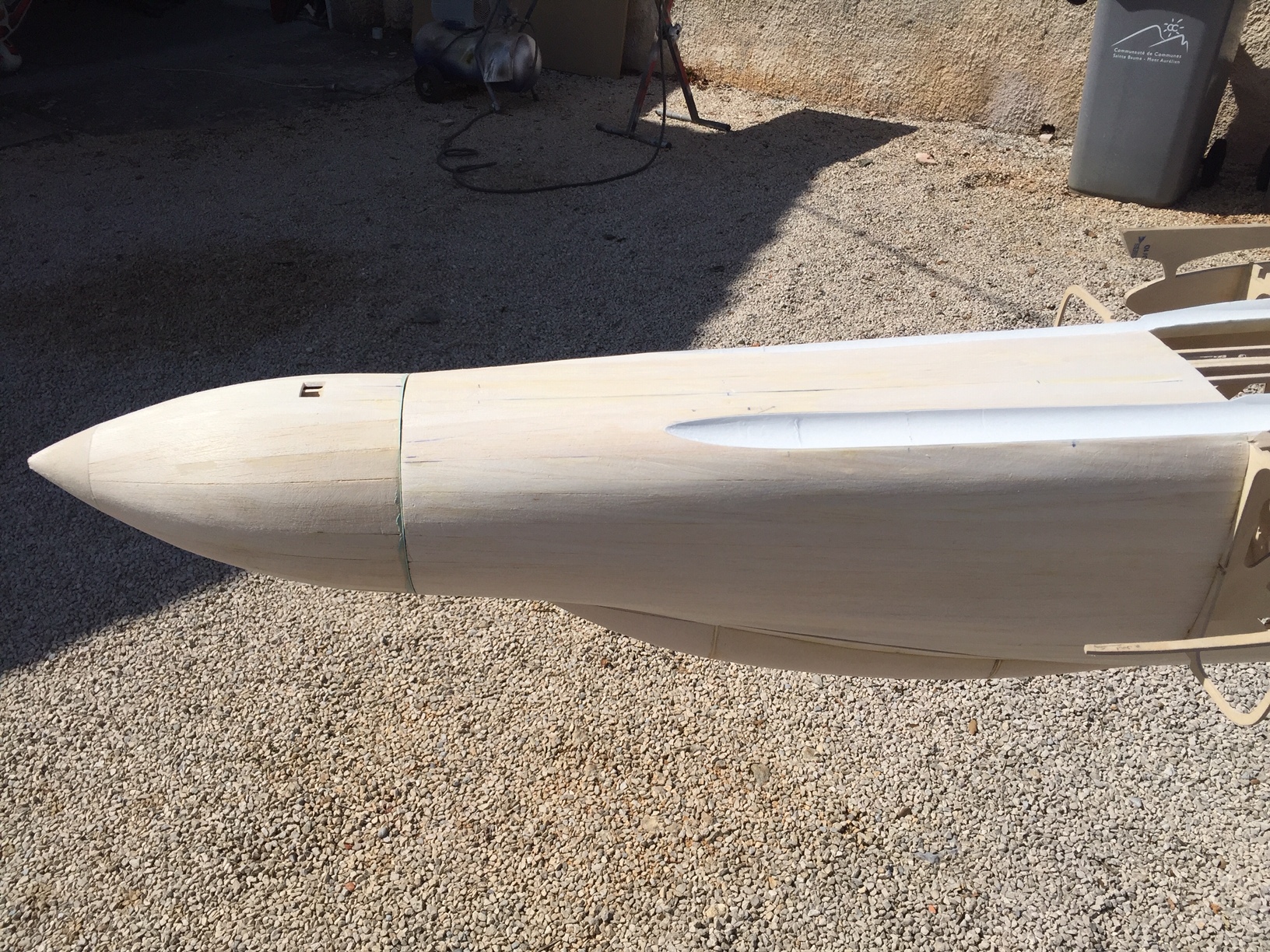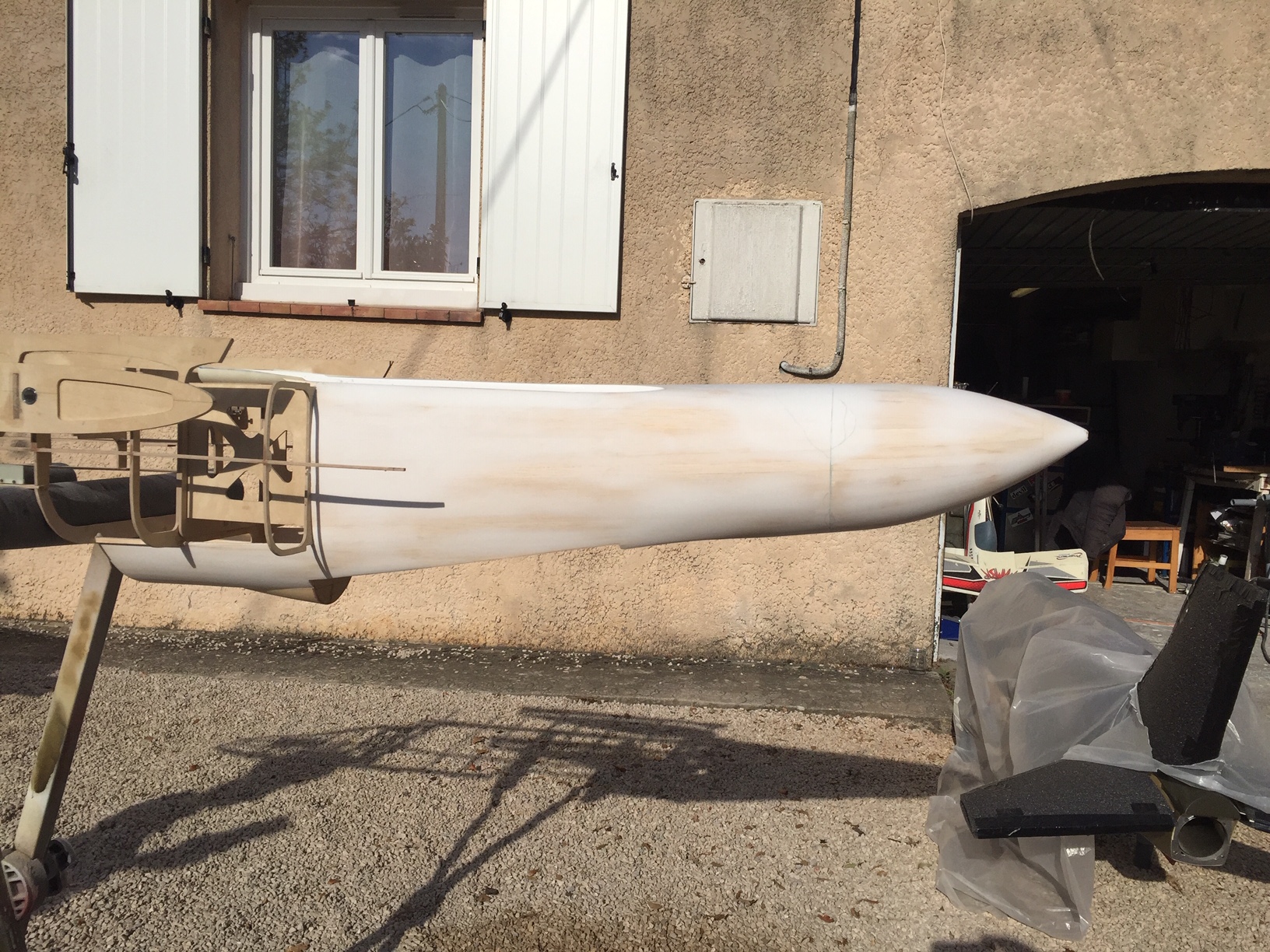 Bonjour à tous, quelques photos en vrac: passages des roquettes en fibres de verre, plan de joint fuselage/radome, il me reste la partie superieur arriere à coffrer (derriere la verriere), puis poncage, application d un bouche pore et fibrage. Photos
