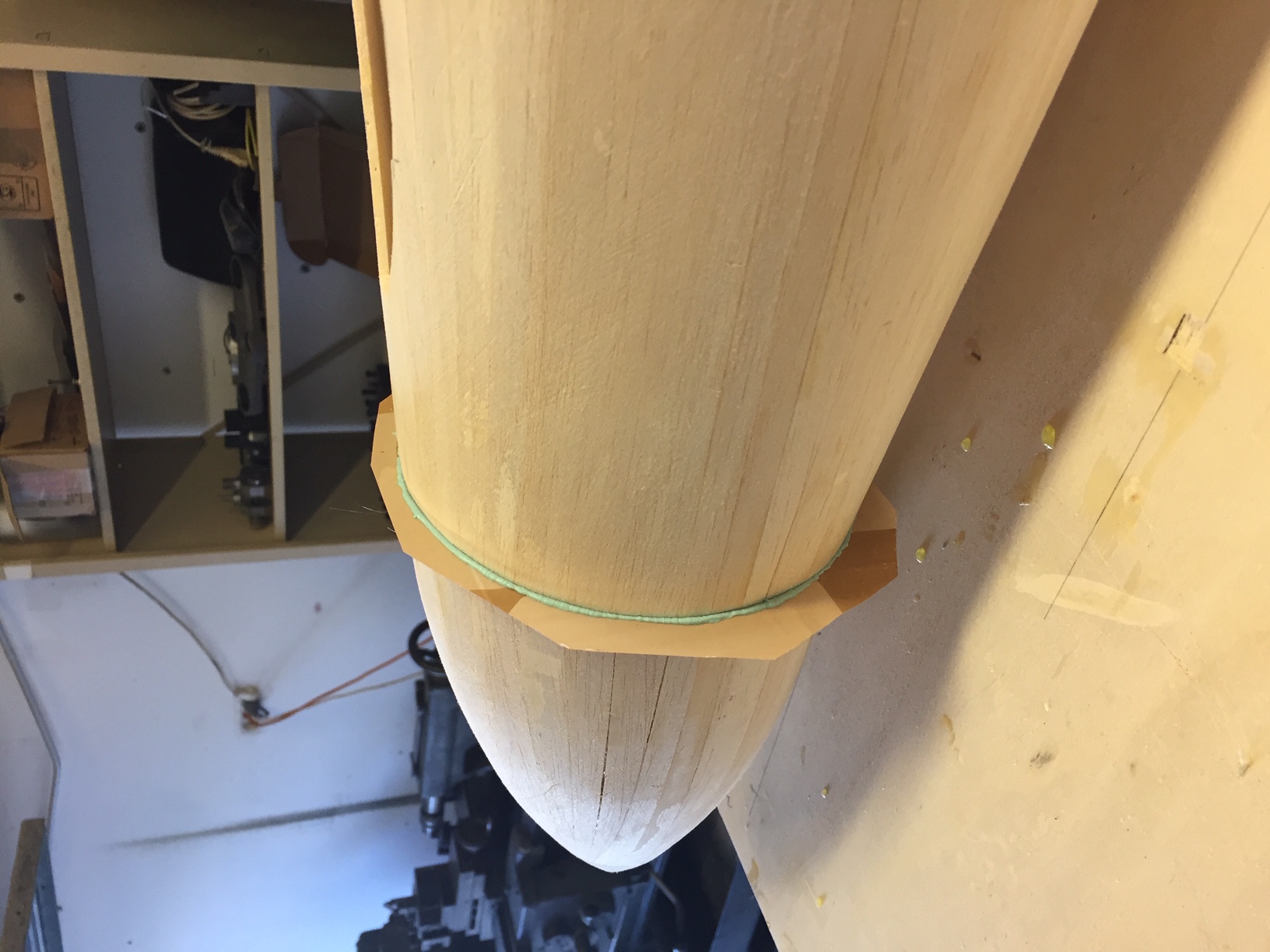 Bonjour à tous, fin de l'application du bouche pore avec poncage (de la partie avant), je commence le fibrage. Cela peut paraitre bizzare que j'avance autant la partie avant, alors qu'il reste tout le fuselage à coffrer, mais c est dû aux entrées d air, qui seront tres proches du fuselage (moins d'un centimetre) et donc rendront le travail (de poncage, fibrage, apret, reponcage, peinture) impossible. Je vais donc avancer au maximum la finition, avant le collage des entrées d'air, et quand celles ci seront collées alors je reposerai le fuselage sur le plan de travail et il n'en sortira que l'orsqu'il sera suffisamment coffré (indeformable) pour terminer le dessous. Sur la photo sur le dos de profil on remarque bien l'effet "banane" Photos