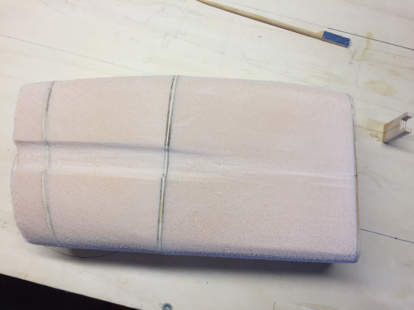Bonsoir à tous, la météo ne m'a pas permis de peindre, et les temperatures frisquettes m'ont poussé à attendre un peu avant de poncer l'aprêt (commencé aujourd hui). J'en ai profité pour commencer les moules des tunnels d air, ils seront réalisés en fibre de verre (même procés que les emplacements des roquettes). Photos