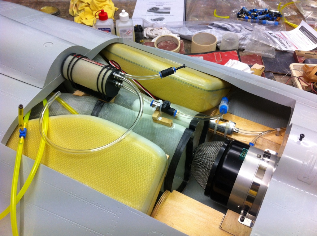 La pompe est installée au plus près du moteur sur la platine en ctp du moteur, à plat. La nourrice et l'écu sont posé sur les conduits d'entrées d'air dans le compartiment moteur. Ça passe dans l'arête dorsale. Rien dans la partie d'arête dorsale entre verrière et capot moteur.