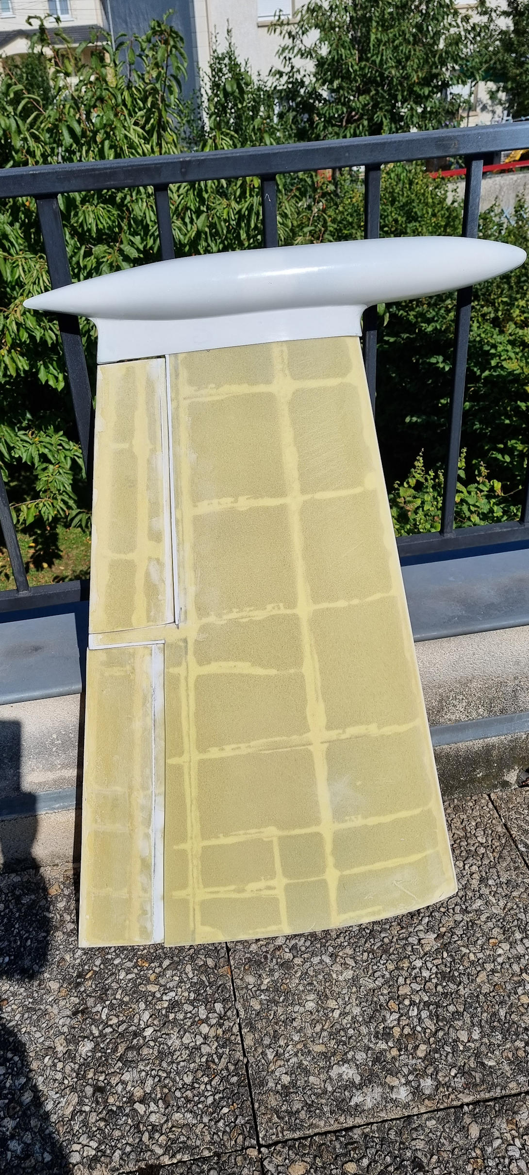 Apres avoir découpé dans un bloc de mousse dur le noyau de l aile on garde les deux dépouilles intrados et extrados qui vont nous servir de moule. On protége la mousse par une feuille de mylar découpée suivant le géométrie de l aile, puis on pose une plaque GFK de 2/10 d épaisseur et on applique au rouleau une couche de résine. On ajuste ensuite la plaque d airex jaune de 12/10 d épaisseur, la couleur jaune étant la densité la plus légère. On passe une nouvelle couche de résine et on applique un tissu de verre satin de 100 gr. Ensuite viens un papier micro poreux puis un feutre de drainage et l’ensemble est placé dans une poche a vide.