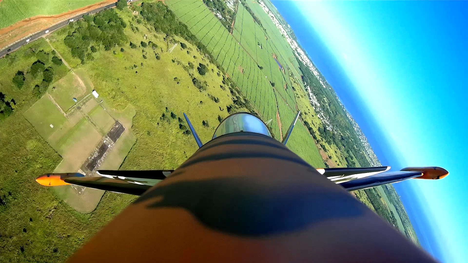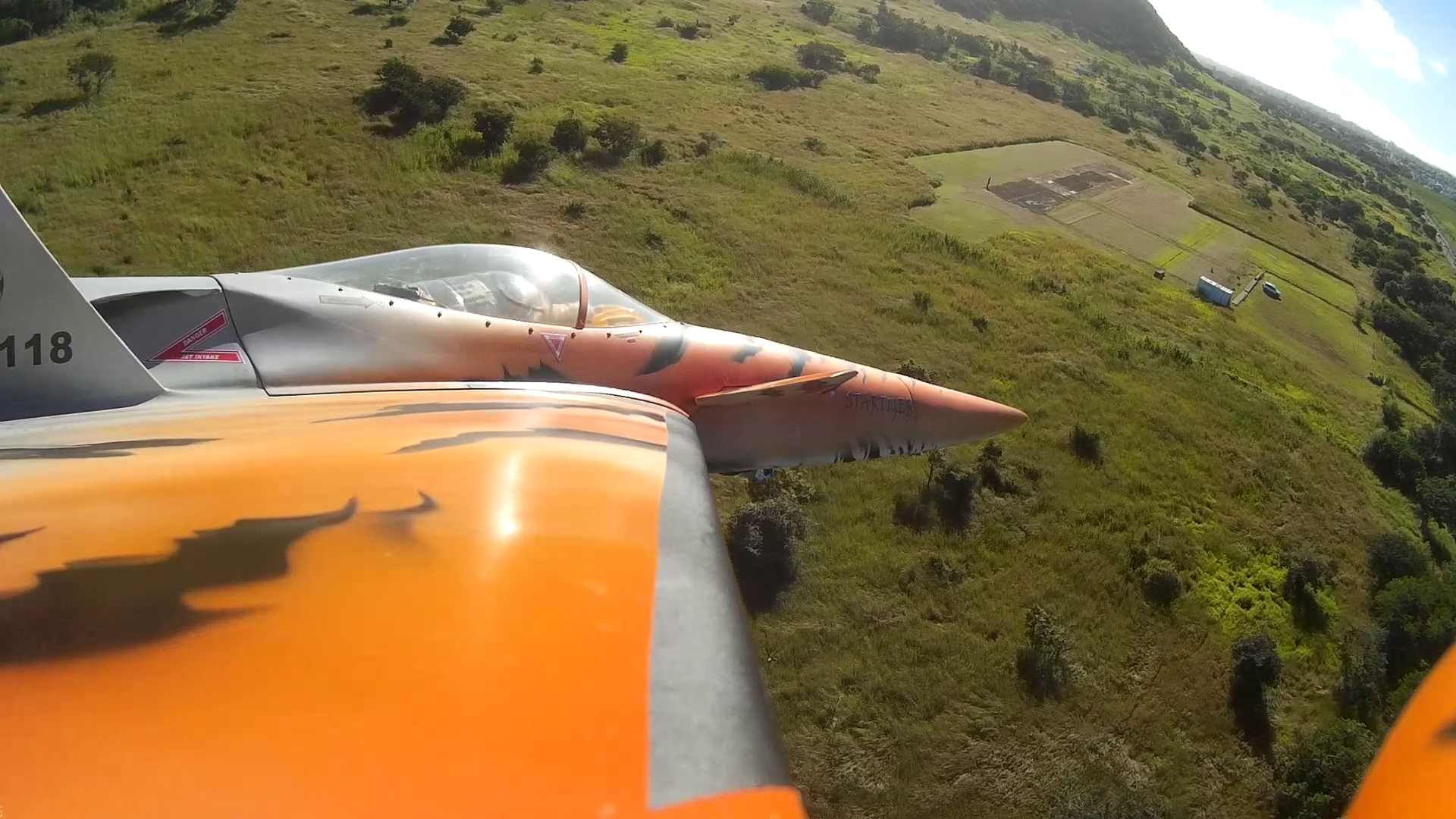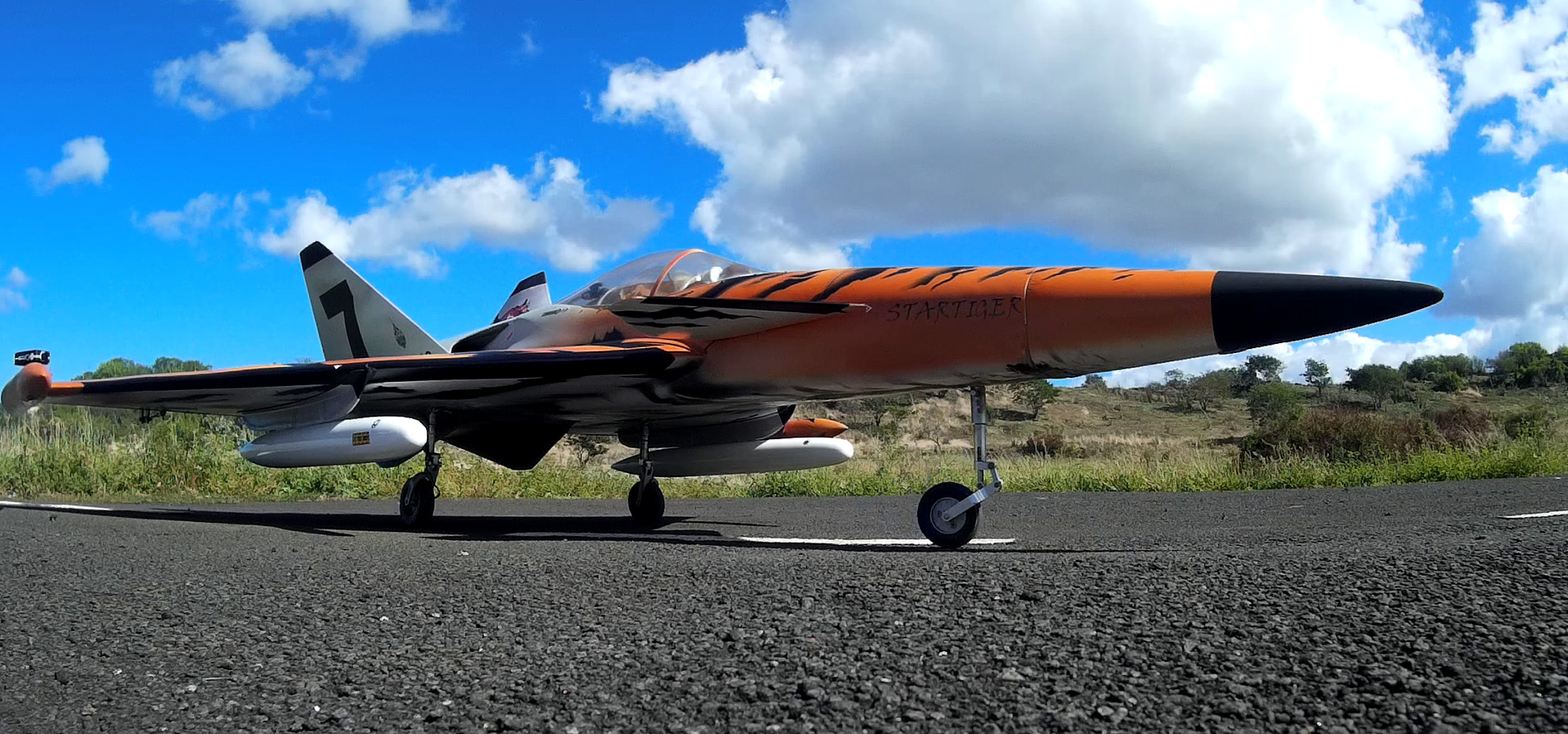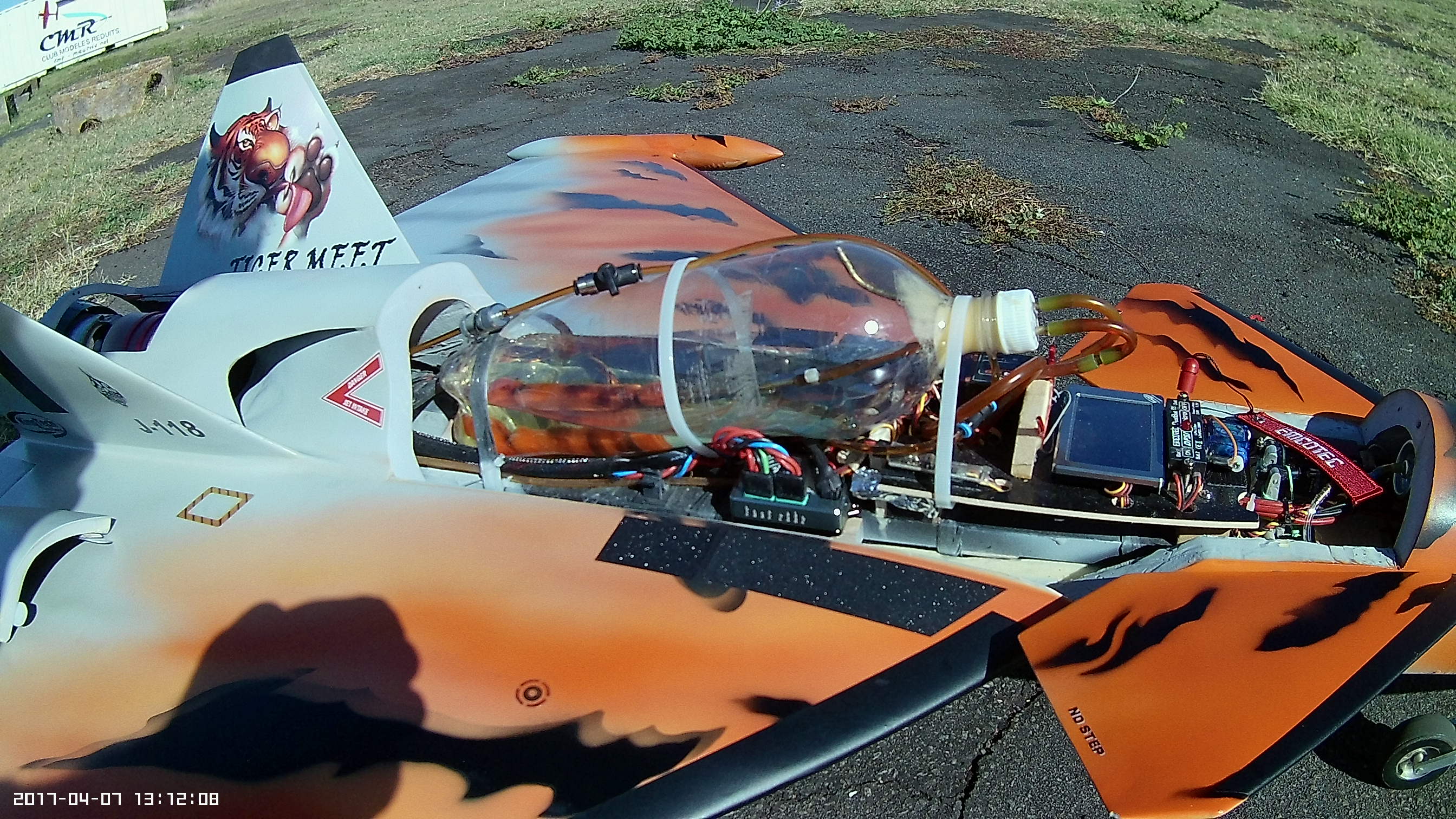 Coté turbine, la K 60 G2 était volable, mais sous dimensionnée. Heureusement Kingtech a eu la bonne idée de mettre sur le marché une K 85 G2, de même dimension et même poids que la K 60. Le jet ainsi propulsé peut enfin donner tout son potentiel et le pilotage devient un vrais régal. Du coup, plus pénalisé par le poids j´ai habillé l´engin de réservoirs d´ailes. Outre le look renforcé, ça fait office de Fences et l´avion a moins tendance a glisser dans le virages.