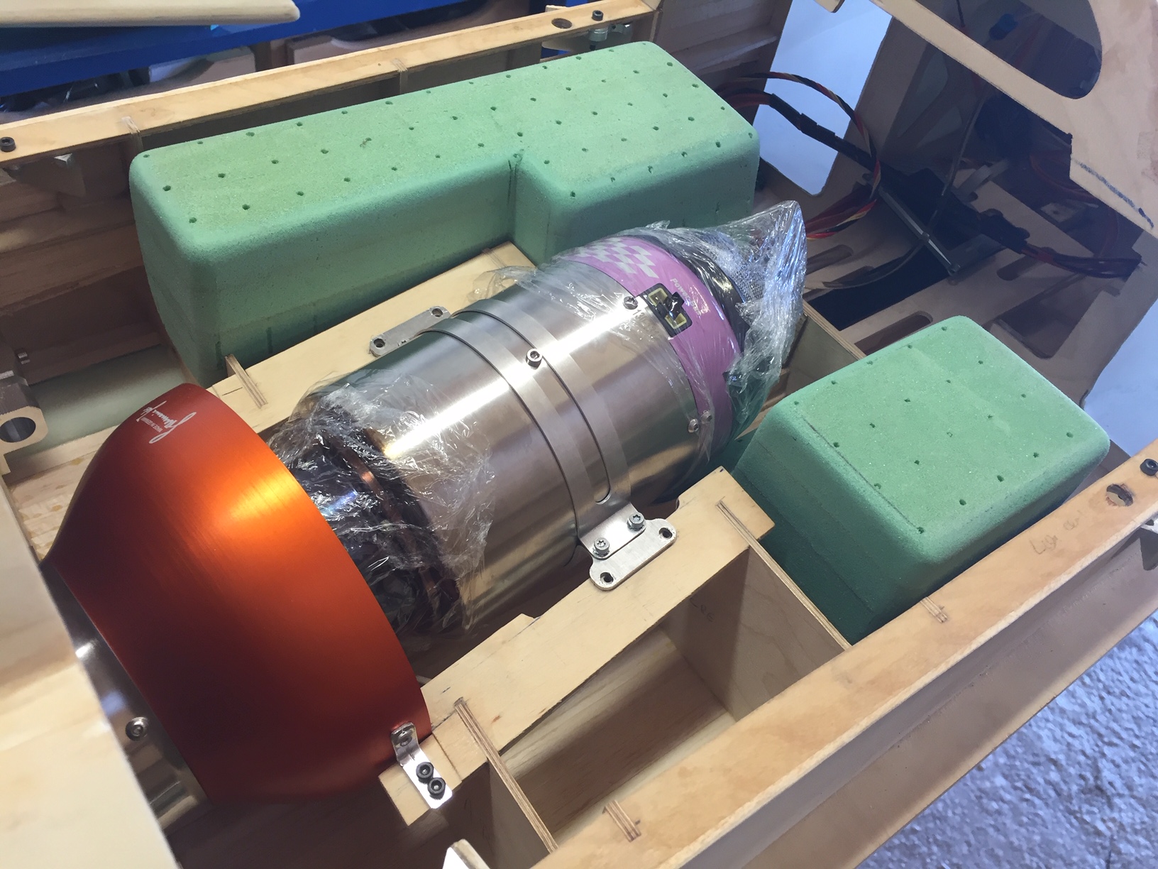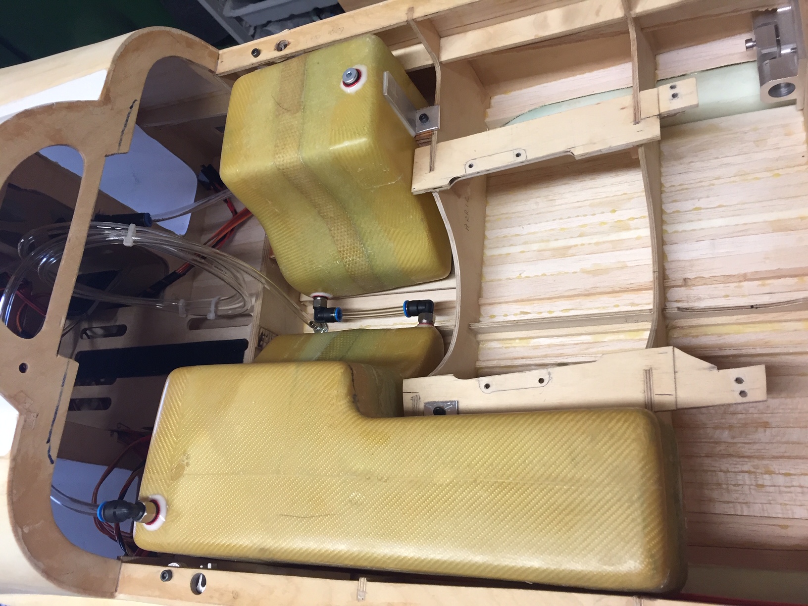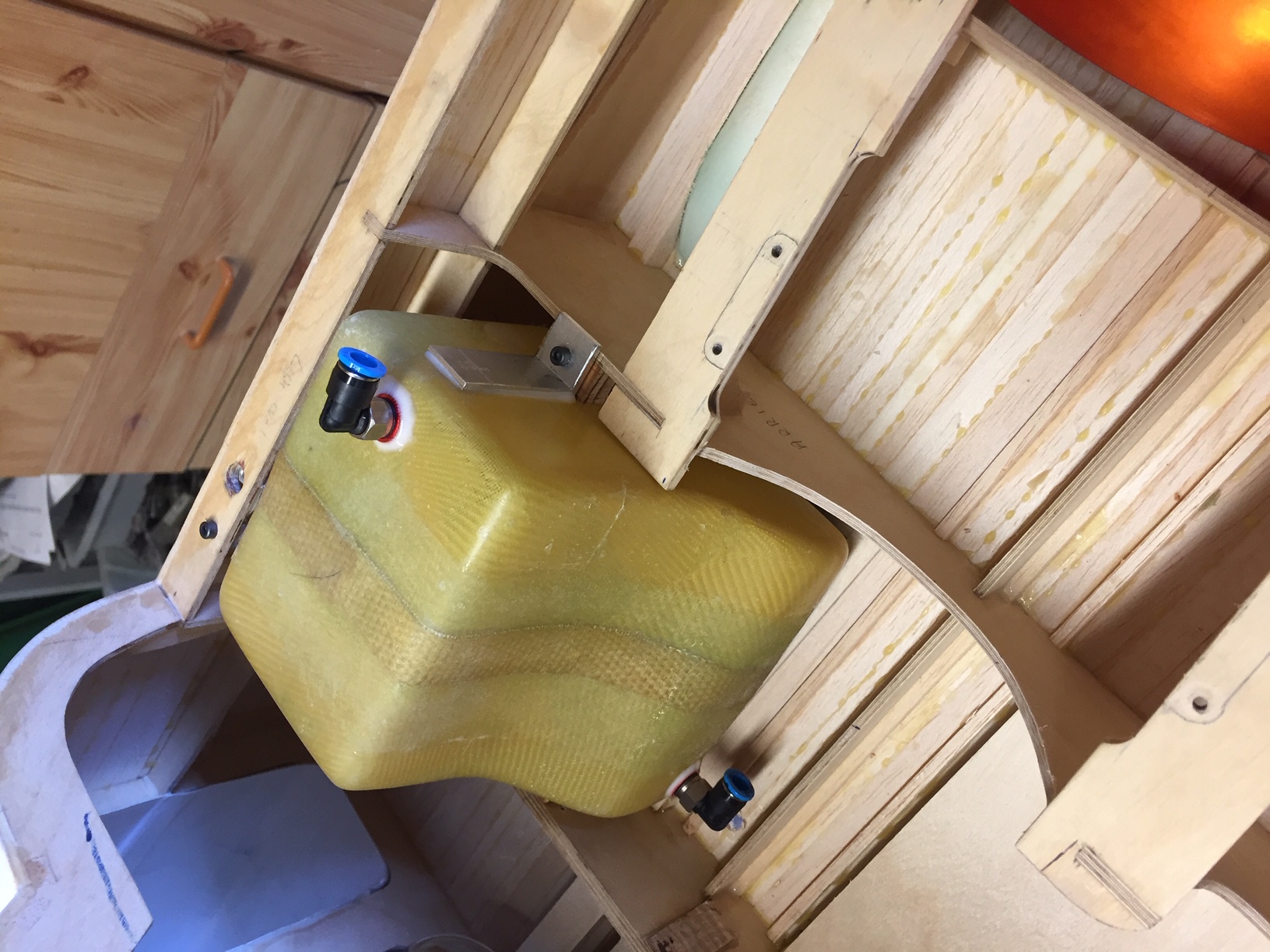Donc aujourd'hui photos du master des deux futurs reservoirs, qui comme vous le constaterez n ont pas la meme forme, car le réacteur n est pas central et en plus de biais (mono tuyère) ce qui ne laisse pas la meme place à droite et à gauche. J'ai déjà réalisé le petit par contre je vais faire un fil détaillé sur la construction du second car les formes sont compliquées et si on veut avoir un reservoir solide et bien étanche tout en restant léger ca va demander beaucoup d étapes. Donc on commence par sculpter les reservoirs (j ai utilisé de l'airex 10mm), on les ajuste à leurs futurs emplacements et on vérifie leur contenance env 3 litres Photos