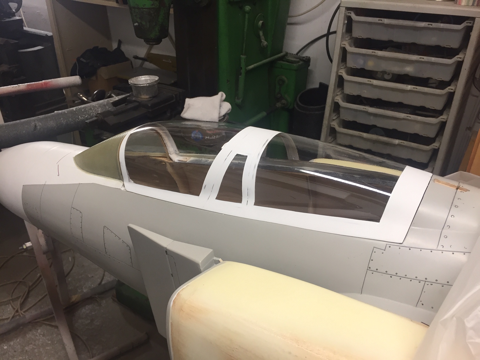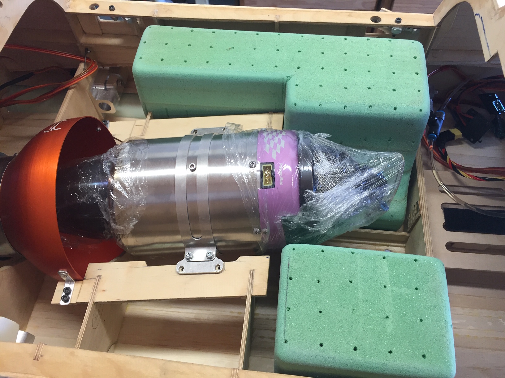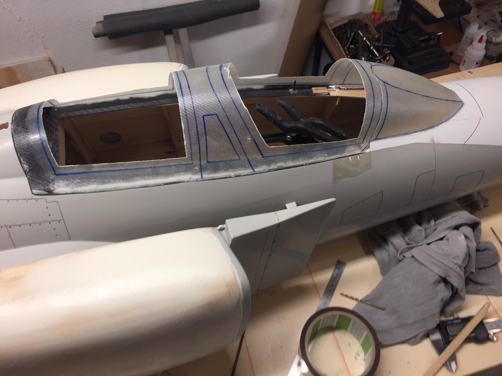 Donc aujourd'hui photos du master des deux futurs reservoirs, qui comme vous le constaterez n ont pas la meme forme, car le réacteur n est pas central et en plus de biais (mono tuyère) ce qui ne laisse pas la meme place à droite et à gauche. J'ai déjà réalisé le petit par contre je vais faire un fil détaillé sur la construction du second car les formes sont compliquées et si on veut avoir un reservoir solide et bien étanche tout en restant léger ca va demander beaucoup d étapes. Donc on commence par sculpter les reservoirs (j ai utilisé de l'airex 10mm), on les ajuste à leurs futurs emplacements et on vérifie leur contenance env 3 litres Photos
