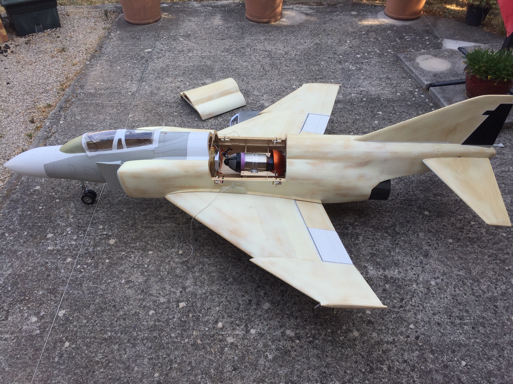J ai réussit à centrer le F4 sans rajout de plomb, il était prêt pour le premier vol, mais mon pilote m'a fait faux bon...je le rappellerai en septembre et en attendant j'en profite pour l'améliorer.(le f4 pas le pilote :D ) J'ai utilisé le reservoir du super Galeb que j avais fixé entre les entrees d'air, mais à cet endroit assez avancé j avais une variation de 35mm du CG entre reservoir plein et vide. J allais être lourd du nez au décollage, hors meme en faisant la jambe de train avant la plus longue possible j arrive a peine a relever le fuselage +0.5°(a rajouter les 1.5° d incidence d aile soit 2°), ce qui m inquiète c est que le positionnement des jambes de train principal se trouvent très en arrière du CG la rotation risque de ne pas être douce, et je ferrai mon vol d essai avec la 130rx (donc pas de surpuissance pour aider), tout ca pour dire qu avec un reservoir sur le centre de gravité, je résous pas mal de problèmes. Poids de l avion reservoir vide uat pleine : 13.200 kg .photos
