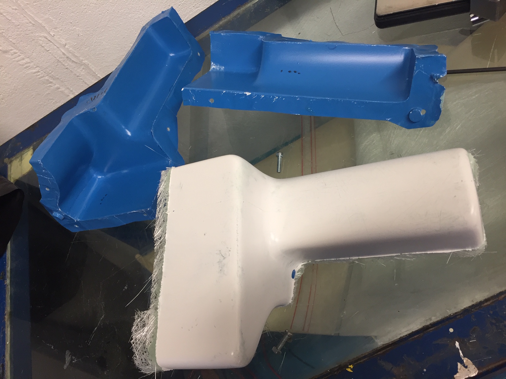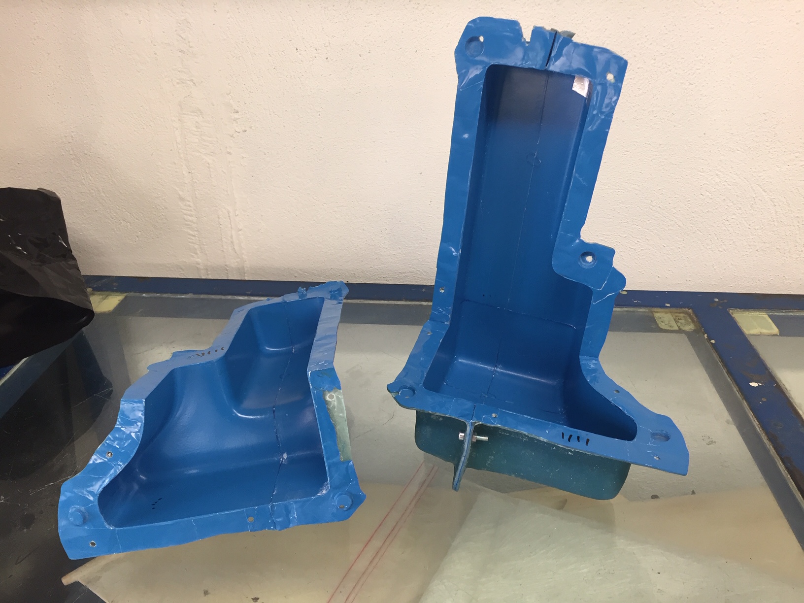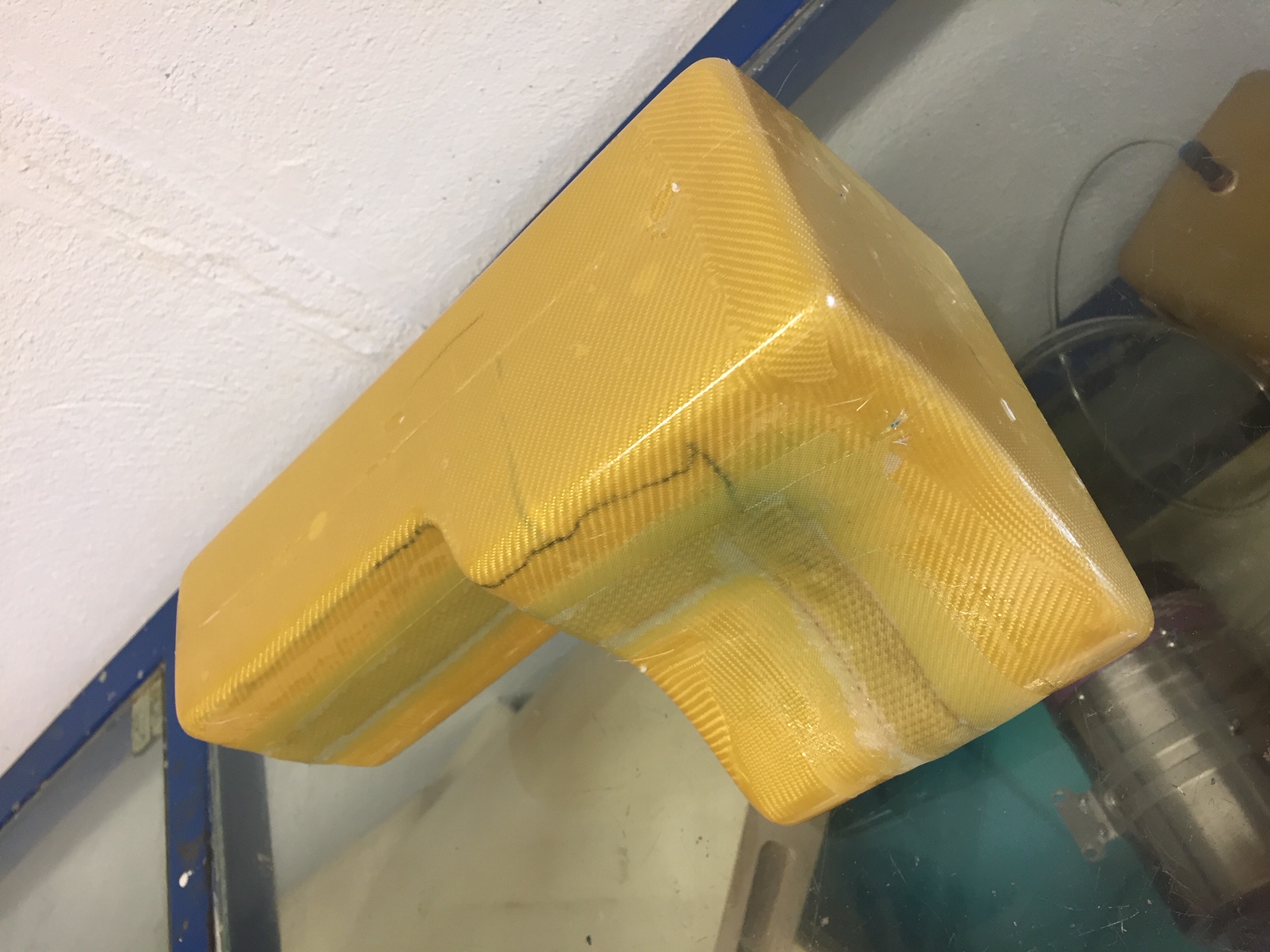 Bonjour à tous, aujourd'hui démoulage des deux demi-coquilles en kevlar, on peut voir des traits rouges aux bordures, ce sont des lanières de tissus d arrachage que je vais enlever avant de coller ensemble les demi coquilles (en enlevant le tissus d arrachage il reste un état de surface rugueux et régulier qui favorisera l'accroche du ruban de jonction). Prochaine étape collage des raccords et test d'étanchéité. Photos