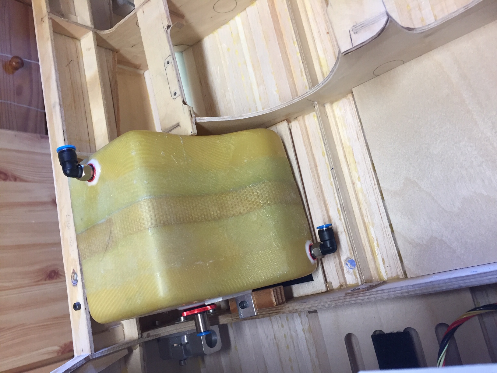 Bonjour à tous, aujourd'hui je pensais en terminer avec les reservoirs, mais ça n'est pas encore bon. Dans un premier temps j'avais prévu une mise à l'air sur chaque reservoir, puis j'ai réalisé que ca ne pourrais pas marcher, car le deuxième reservoir contient 1.5l alors que le premier (celui ou est branché la pompe) seulement 1 litre, et comme ils sont reliés par le point le plus bas quand le deuxième aura 1 litre et que le premier sera plein (1l) tout le kero partira par la mise à l'air (du premier) sans pouvoir remplir le deuxième. Donc je decide de mettre un bouchon pour fermer la mise à l'air du premier et forcer le remplissage du deuxième et je commence a remplir.....et là le kero passe directement dans le deuxième reservoir :shock: normal le kero arrive dans le reservoir et l'air ne pouvant pas s'échapper, ce reservoir reste quasi vide! Je pense donc rajouter un insert avec connecteur sur le dessus du deuxième reservoir et le relier (par une durit) au premier en remplaçant le bouchon par un connecteur. Le bon coté c'est que le centre de gravité est maintenant parfaitement stable et je l'ai mis à 320mm du bord d'attaque. Photos