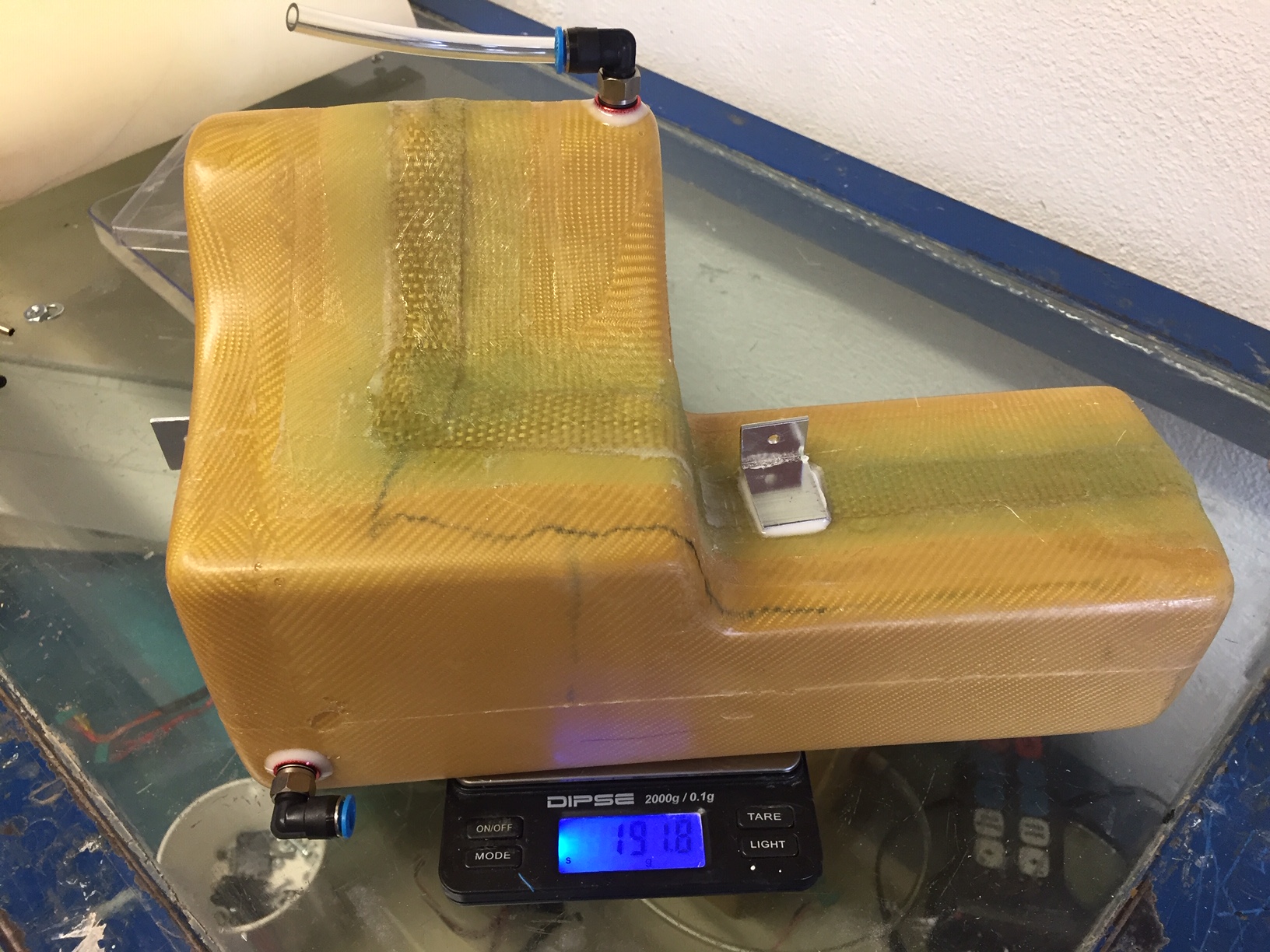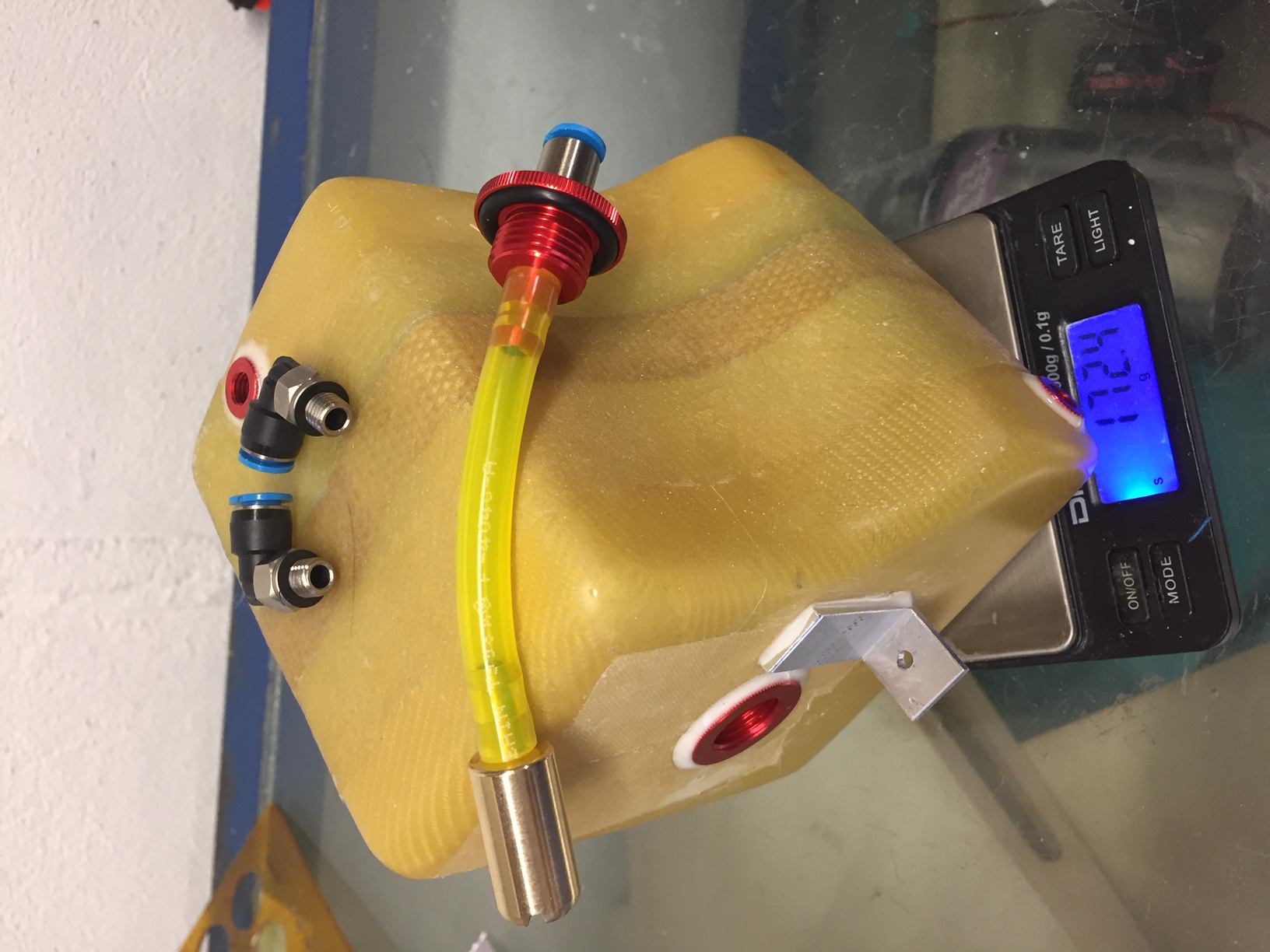Bonjour à tous, aujourd'hui verification de l'étanchéité des reservoirs: le petit ok le grand est à reprendre (jonction des demi-coquille).Donc je vais m'occuper de la fixation du petit (à peine 100grs, mais avec les raccords, durit, plongeur etc j'arrive a 170grs :? ...). Photos
