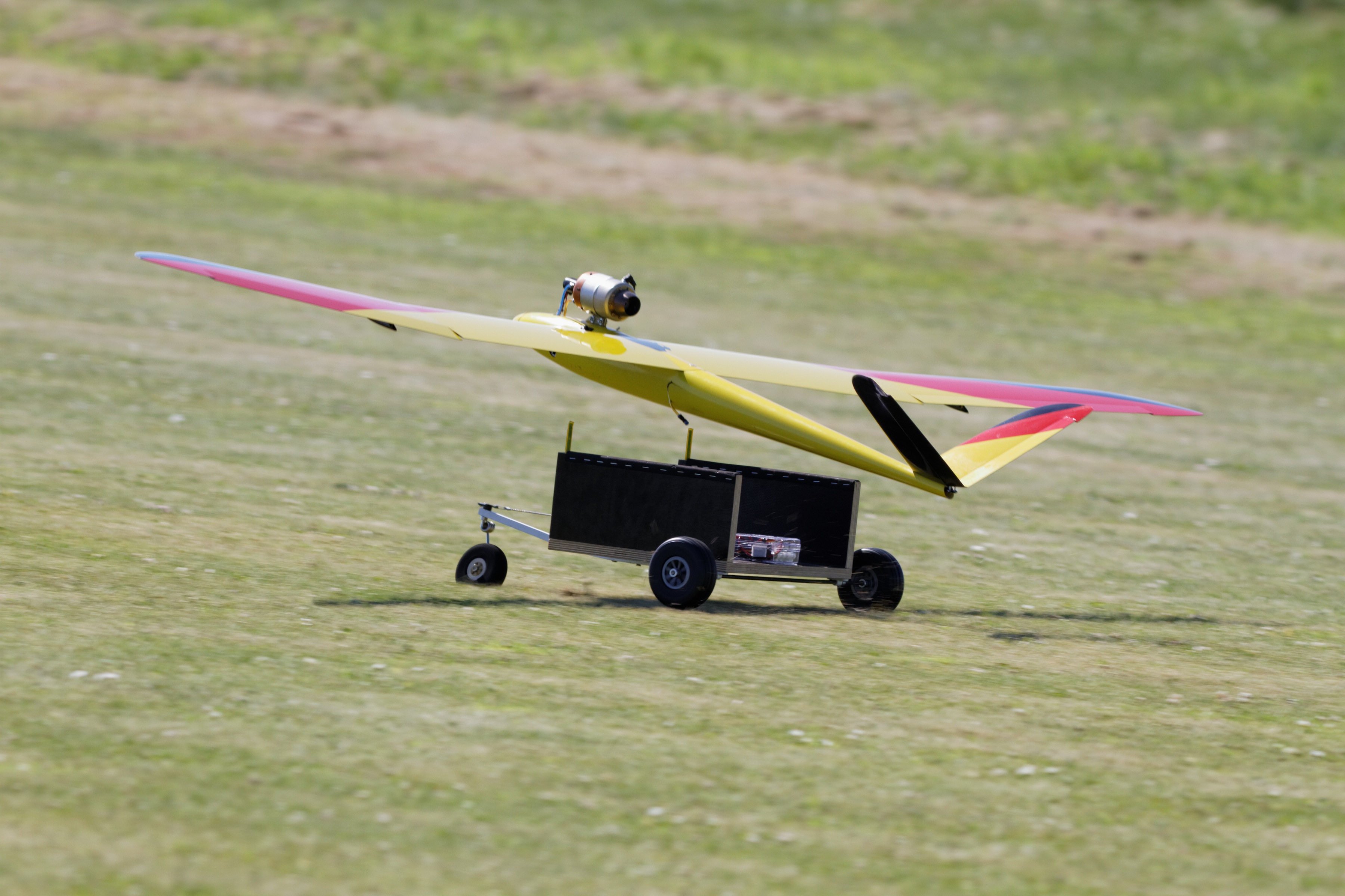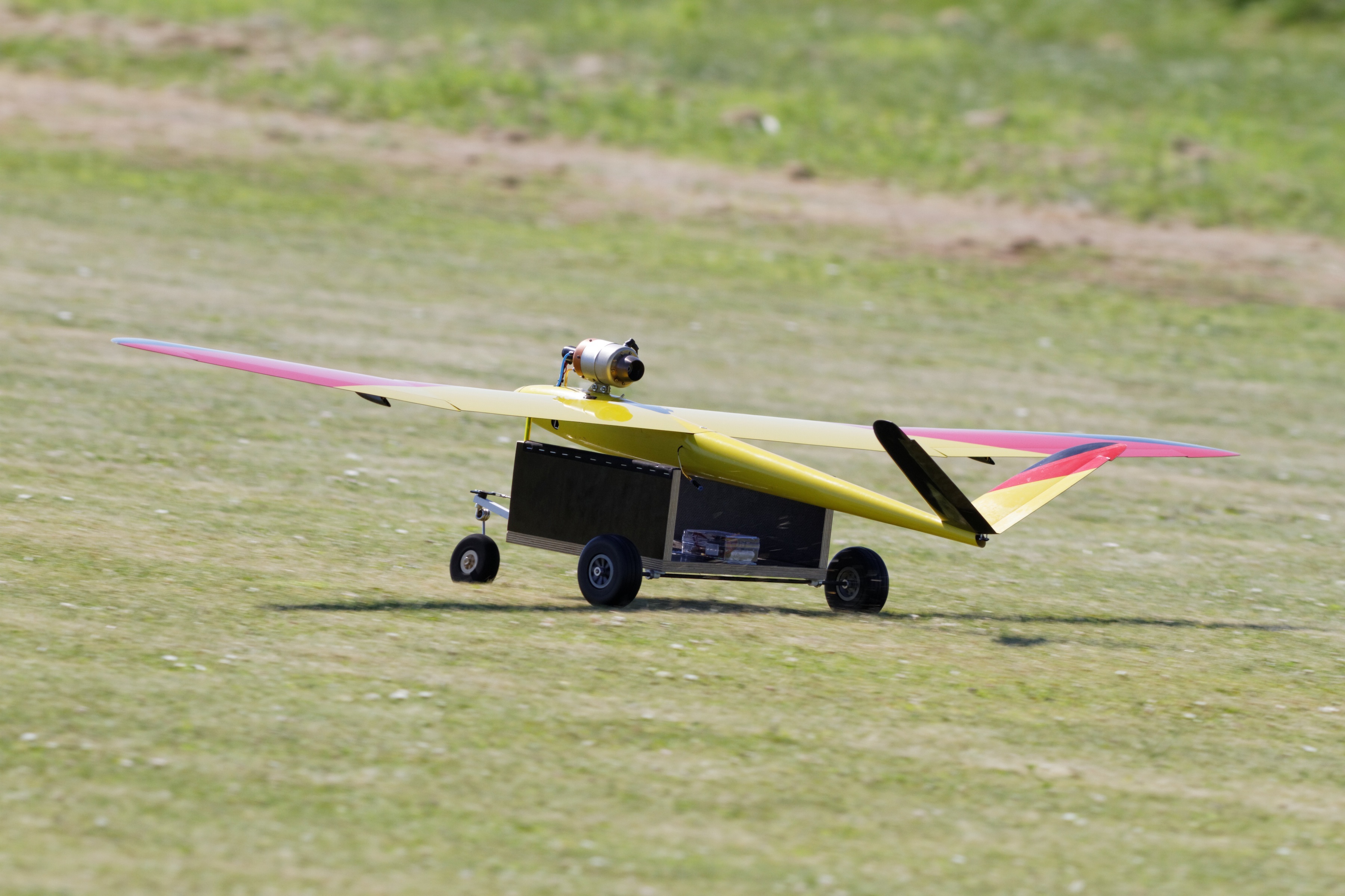 comme le dit le titre j'ai tenté le coup, javais envie d'essayer depuis quelque temps ce modèle qui peut quasiment voler tous temps sur une piste en herbe, la configuration choisie est le montage d'une T 25 assurant 380 km/h et avec charriot au décollage .