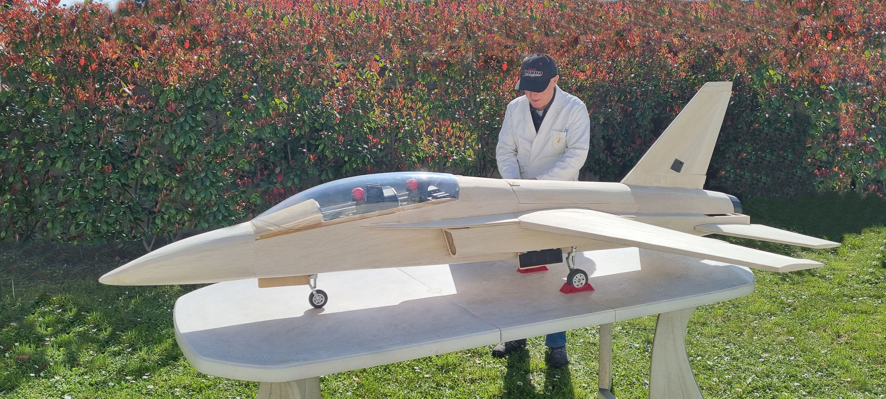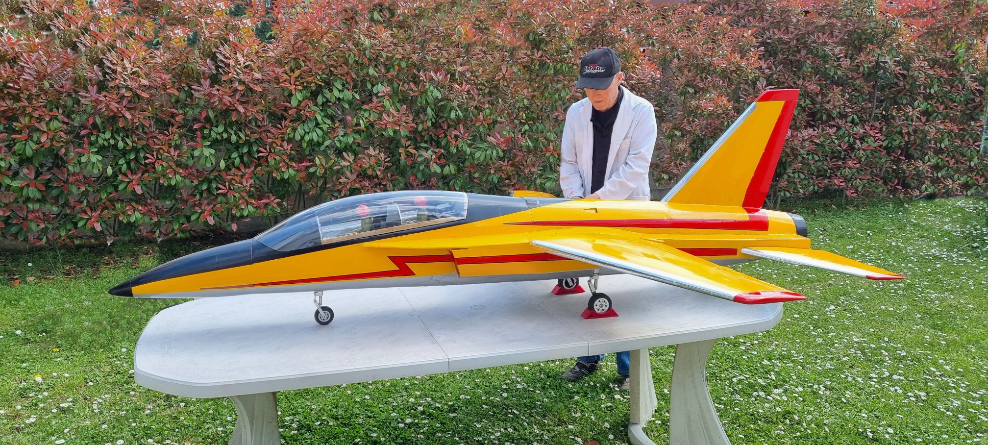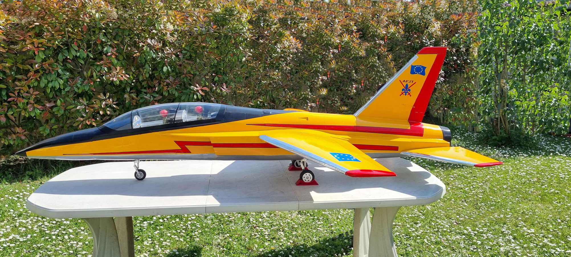 Pour ce premier vol le modèle est équipé d un 18 kg de poussée (JetCat P 180 NX). Apres avoir réalisé plusieurs hippodromes pour une prise en main, d’environ 5 minutes. Première analyse : les ailerons manquent d’efficacité, par contre la profondeur est sensible et les 18 kg de poussée sont trop puissants. De retour a l atelier le réacteur est remplacé par un 14 kg de poussée, et les débattements des différentes gouvernes sont modifiés.