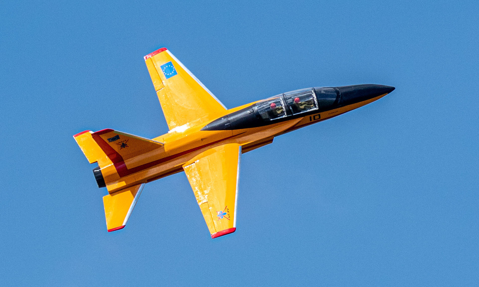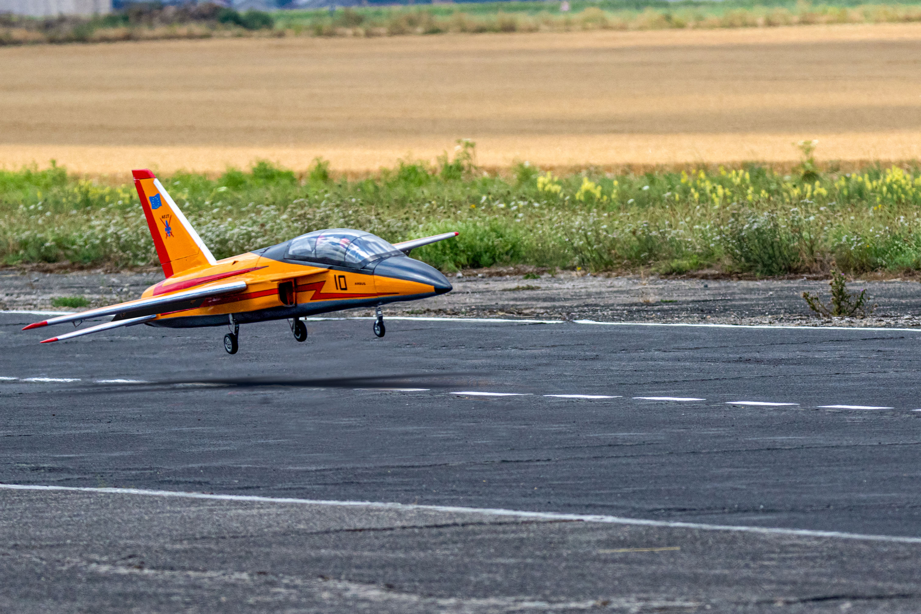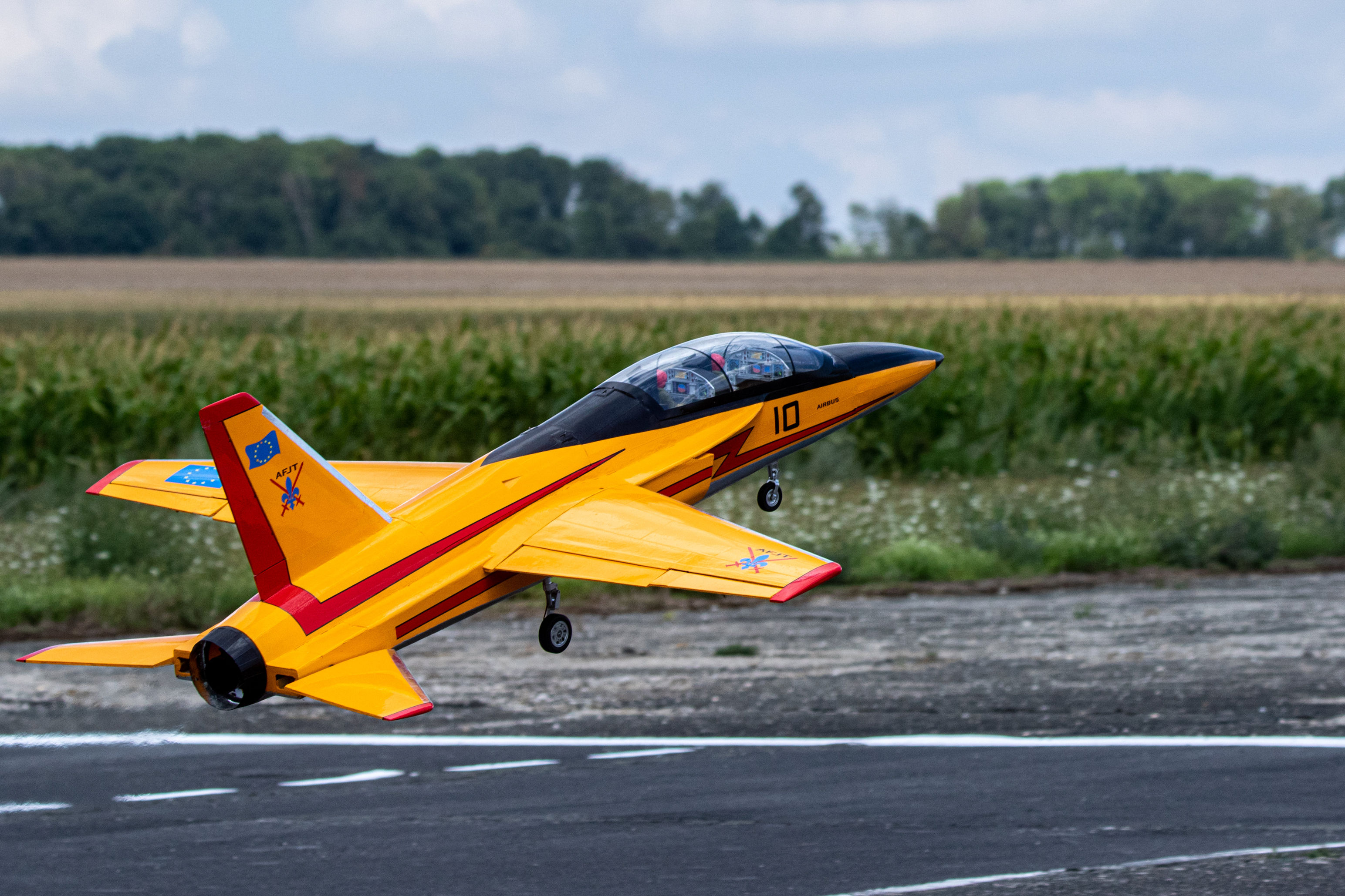 Pour ce premier vol le modèle est équipé d un 18 kg de poussée (JetCat P 180 NX). Apres avoir réalisé plusieurs hippodromes pour une prise en main, d’environ 5 minutes. Première analyse : les ailerons manquent d’efficacité, par contre la profondeur est sensible et les 18 kg de poussée sont trop puissants. De retour a l atelier le réacteur est remplacé par un 14 kg de poussée, et les débattements des différentes gouvernes sont modifiés.