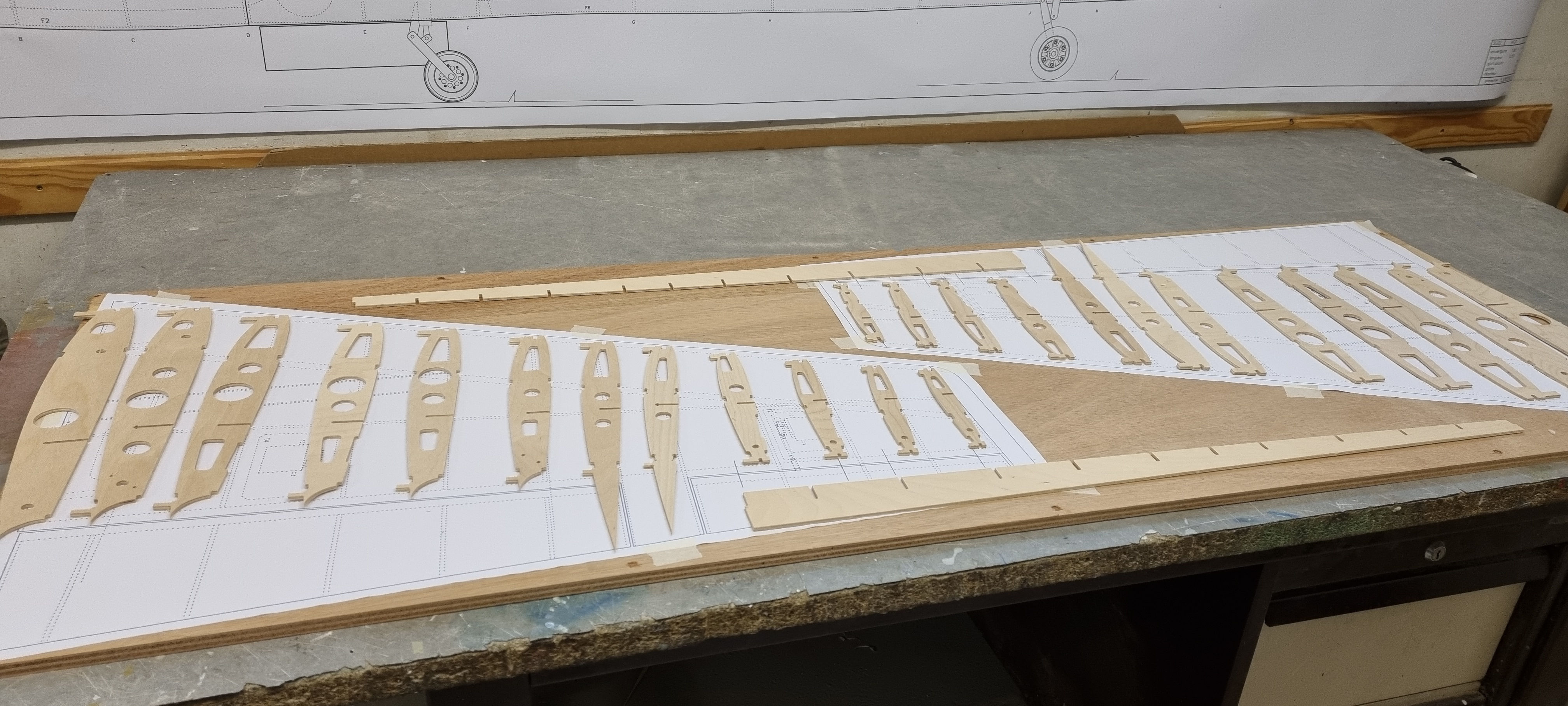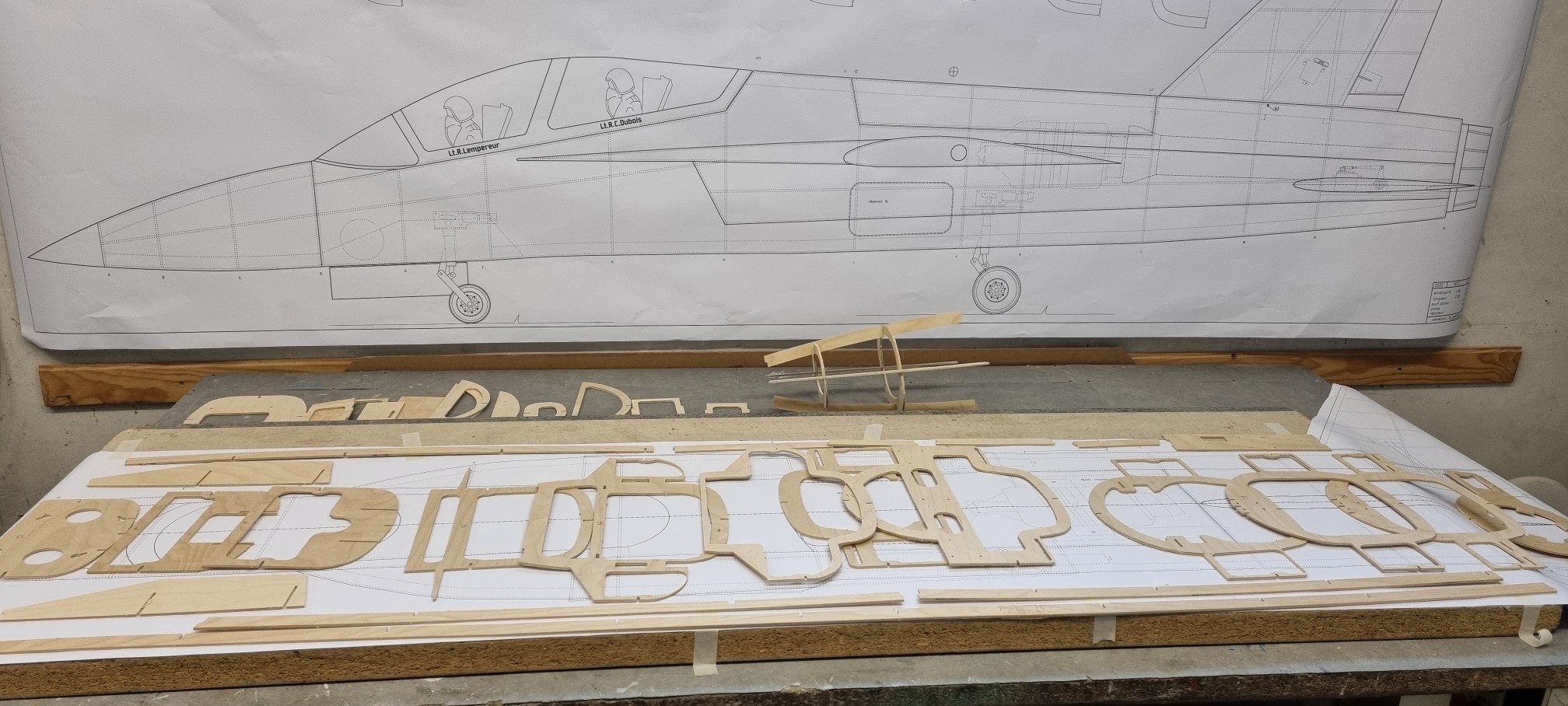 Je cherchai depuis un certain temps un nouveau modèle avec une certaine originalité. Dans un premier temps, mon choix se porta sur le nouveau jet d entraînement de chez Boeing le T-7A. Mais j ai été freiné par un élément majeur son train qui est la copie de celui du F-16, avec sa cinématique si particulière, et sans compter le nombre de pièces a usiner pour l adapter a l échelle de mon futur modèle . Puis au début de cette année voila que la Sté Airbus présente la maquette de son futur avion d entraînement l’ AFJT (Airbus Futur Jet Traîner). Très similaire au T-7A mais avec un train classique et cerise sur le gâteau il n y a qu’une seule dérive comparé au T-7A qui en a deux. Mon choix était fait, reste maintenant à en déterminer les caractéristiques, sachant que la maquette présentée pouvait subir certaines modifications. Longueur du fuselage 2.50m pour une envergure d’environ 2 m. Fin janvier l’épure est terminée et fin février les premières pièces du fuselage sont prêtent a être découpées