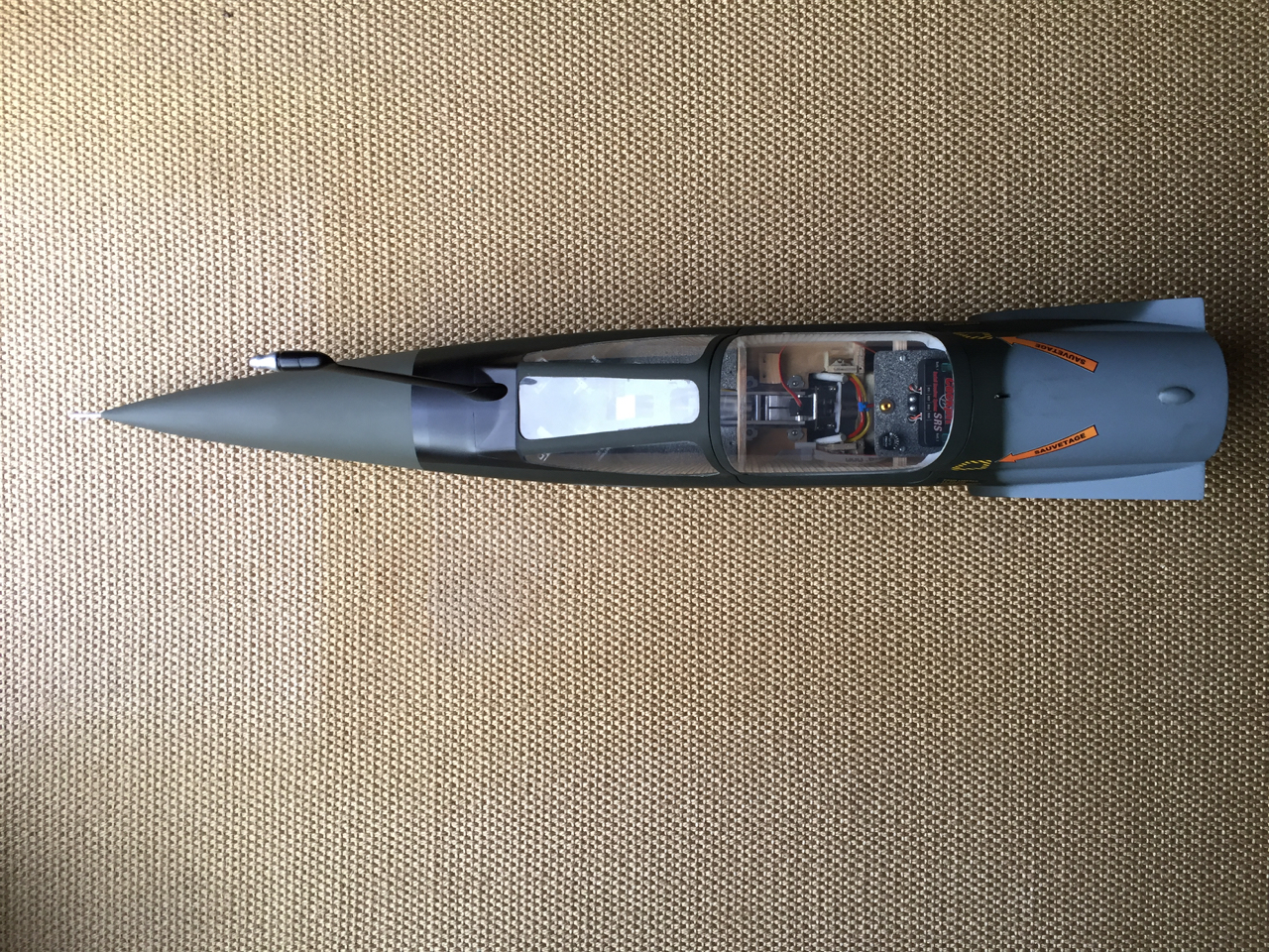Bon pour clarifier, j'ai fait un devis masse (en pesant les éléments séparément): 13,7 Kg à vide, avec les 3 batteries (Rx & ECU), les 3 bidons (ailes et ventral), les 2 missiles, le cockpit & pilote inclus. Pas si mal je pense