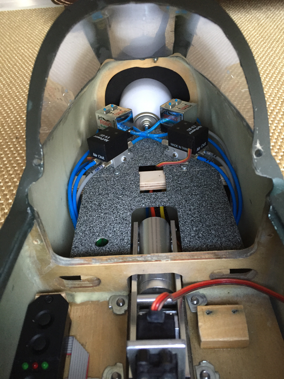 Une platine avec 4 électrovannes et la bouteille de 600ml qui les alimentent: trappes (2 vannes car trappes séquencées en 2 groupes, 1 groupe se referme train sorti, 1 groupe reste ouvert), vanne des aérofreins, vanne de freinage. La bouteille est enfilée dans le cône avant, et la platine vient juste devant pour la bloquer. Au final beaucoup de tuyauteries à bien organiser pour la fiabilité, il faut "router" tout ça vers l'arrière pour la connexion avec la 2ème partie du fuselage principal.