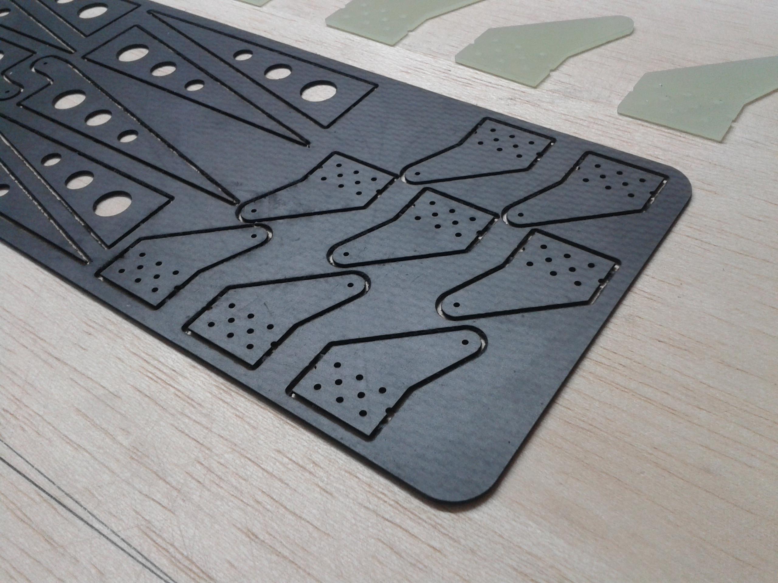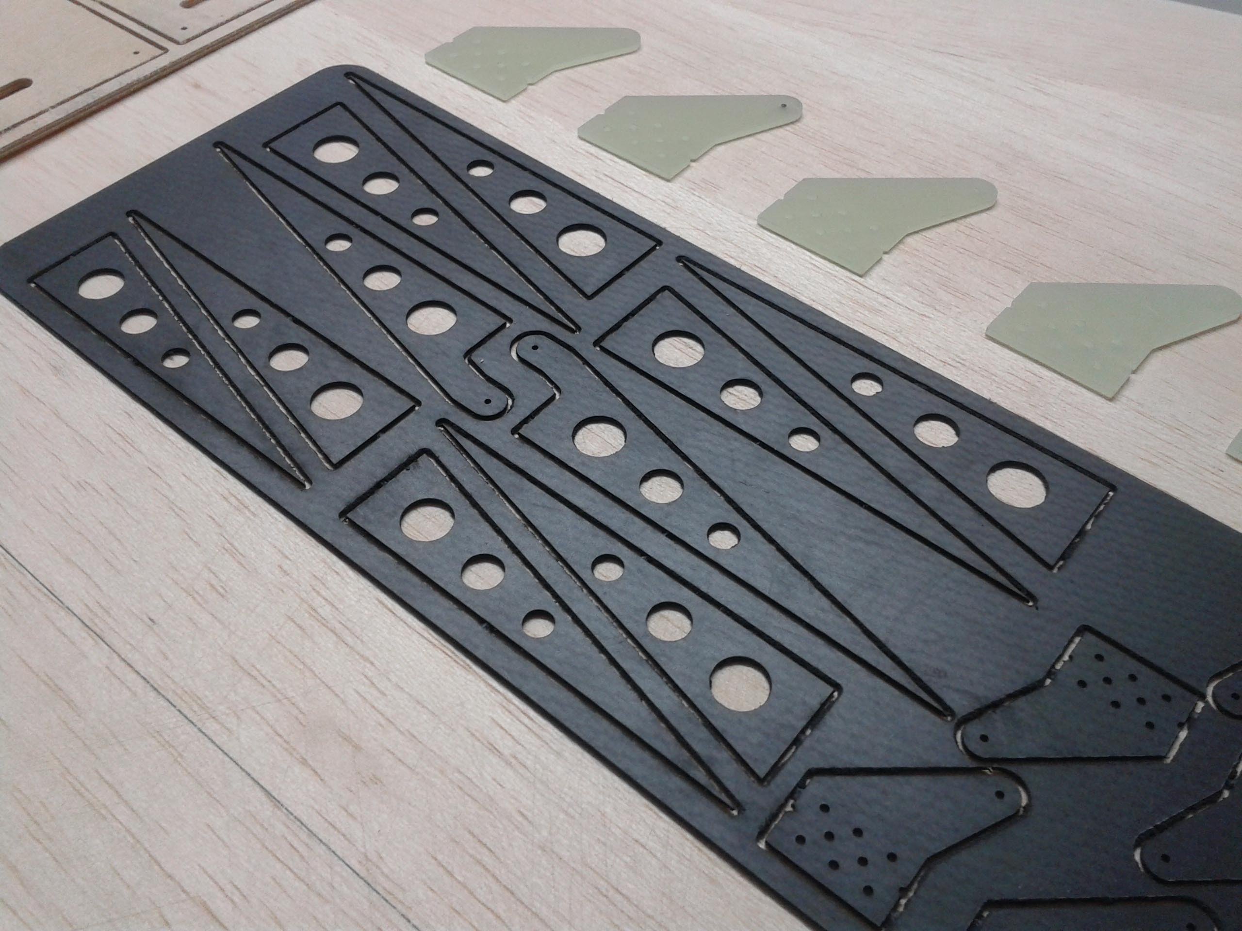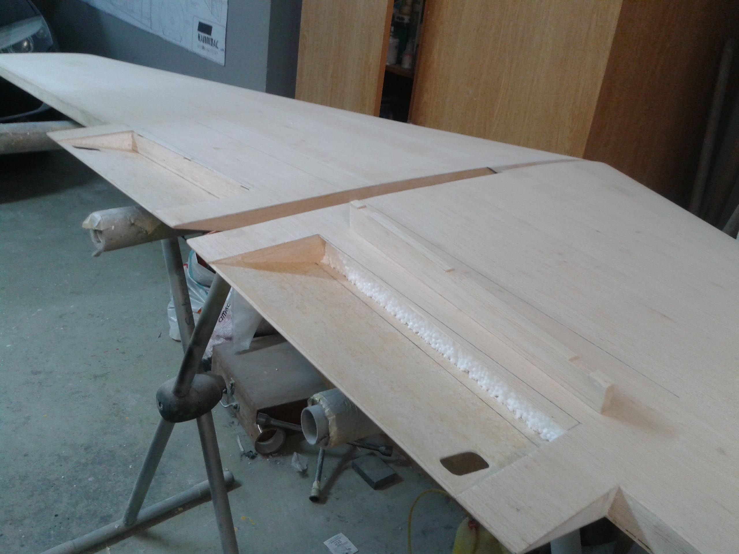 J'ai réalisé les volets d'intrados, âme en balsa dur, nervures en carbone 1 mm, plaque en CTP 1 mm fibrée, le tout apprêté (1 volet pèse 60 grammes):