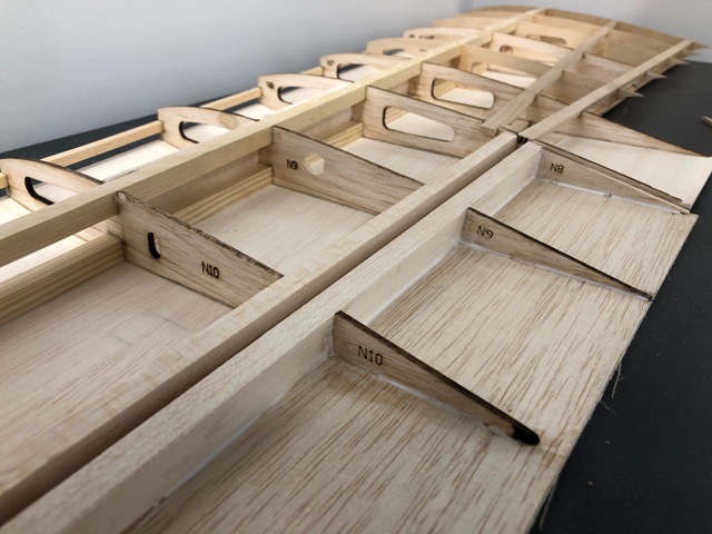 Le montage à blanc se passe bien, contrôle de géométrie. On y va pour les collages à la colle blanche. Quelques pointages à la cyano et on peut continuer rapidement le montage. Mise en place des baguettes triangulaires là ou c’est possible et après une nuit de séchage on peut manipuler le fuselage et finir la pose des baguettes triangulaires.