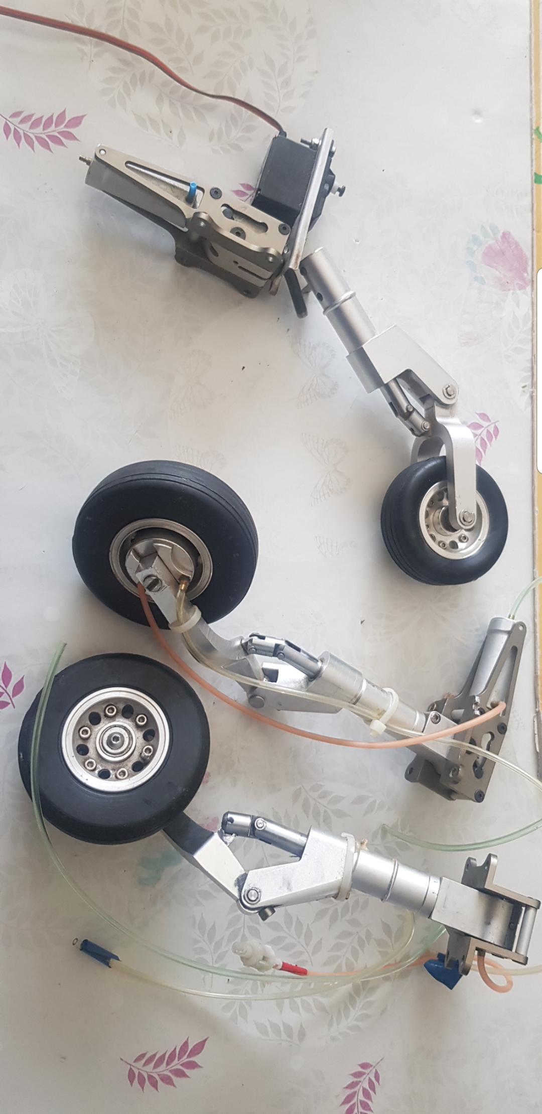 Suite à atterrissage difficile et sortie de piste haute herbe, la cellule ayant etait endommagé, je revend le train rentrant pneumatique freiné de mon hawk skymaster de 1m80 environ. Avec ou sans accessoires pneumatique et habillage jambe.