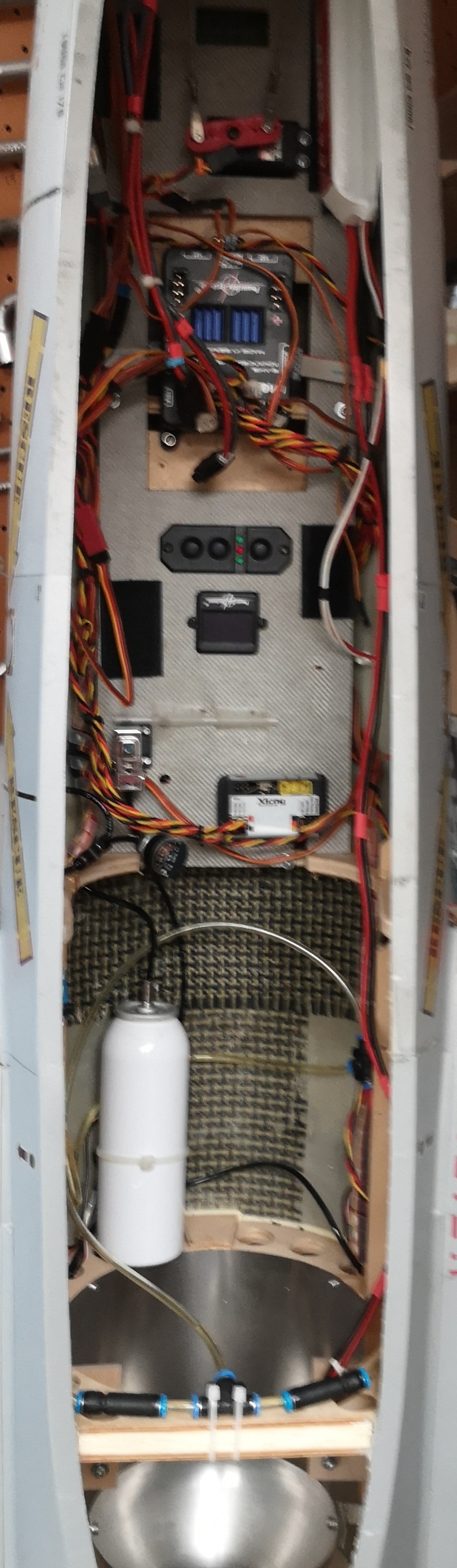 12 Servos , AF maquette ,Volets, train rentrant électrique et jambes Behotec C36, trappes de train maquette, freins pneumatique, cockpit maquette avec pilotes, éclairage, interface PowerBox Mercury SRS. Accus Lipo.