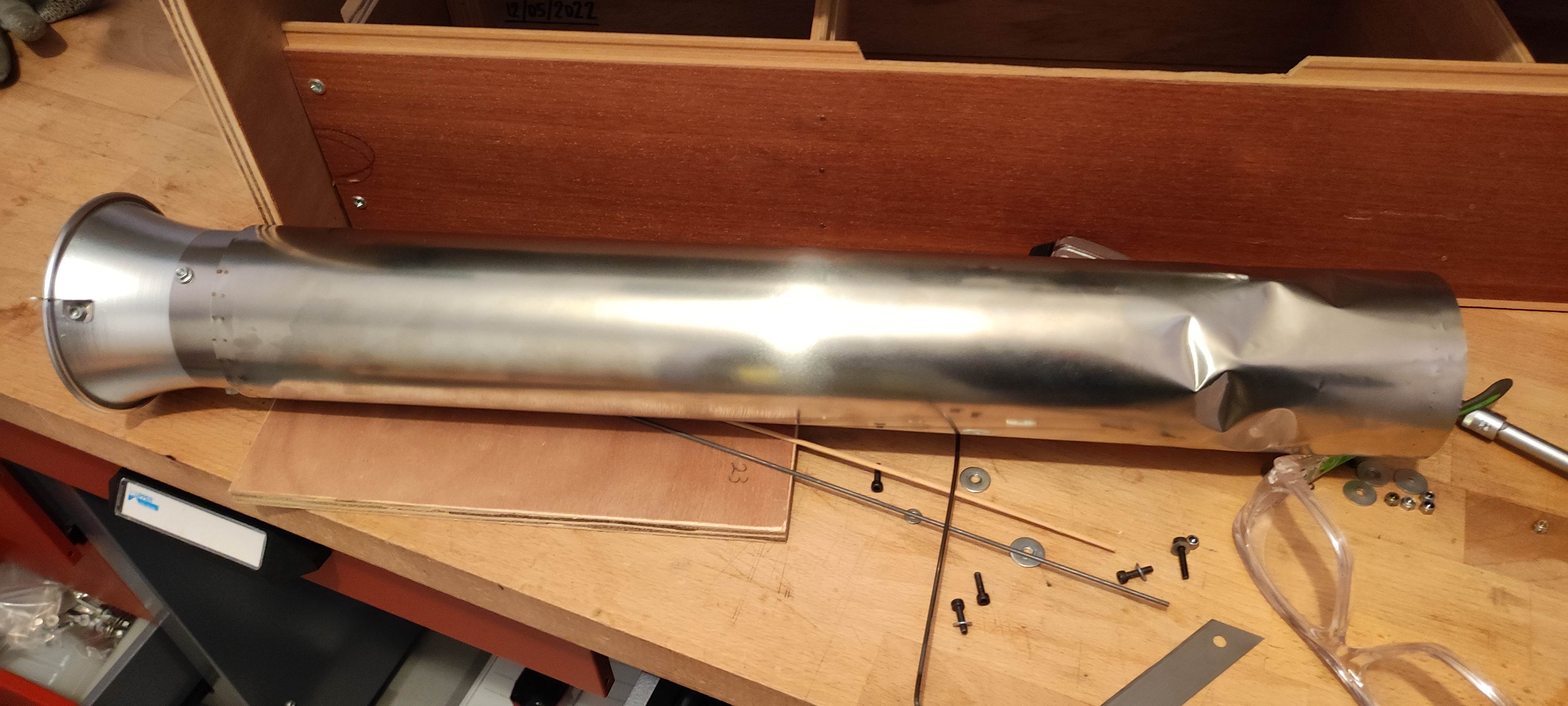 le tube extérieur doit être couplé avec le tube intérieur pour ne pas qu'il glisse en translation. le tube intérieur est en inox et celui extérieur est en alu (il n'est pas soumis aux fortes températures, il sert juste à faire barrage avec le reste de la structure par un matelas d'air), il ne peut donc pas y avoir de soudure entre l'alu et l'inox. En général, il y a deux languette en tôle ondulée inox qui servent à maintenir l'écart entre les 2 tubes. Une en entrée du tube, l'autre en sortie. Elles sont soudées par point sur le tube intérieur. Puis le tube extérieur en alu est riveté seulement sur la languette du début. en général, les rivets sont à 3 ou 4 cm du cône venturi.