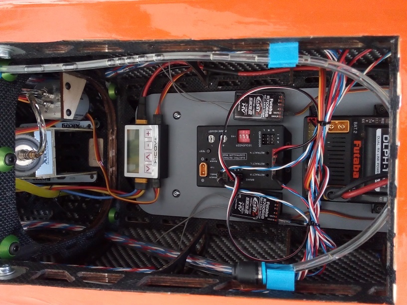 Pour l'alim du train et des freins, compte tenu de la masse de batterie nécessaire (4000 mAh pour le moteur et 2 fois 4000 mAh pour la réception dans mon cas ) j'ai alimenté le train er les freins en direct sur une des batteries de réception : Le delta de conso est quasi nul entre les 2 batteries et est annulé par la box.