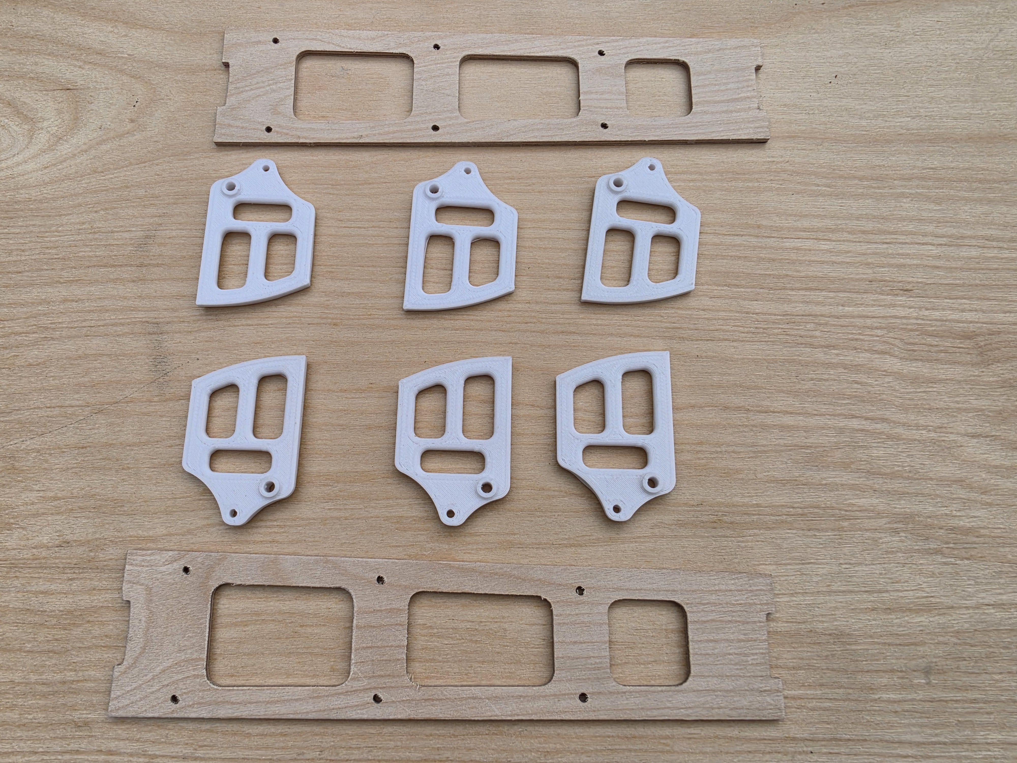 Mais le premier travail consiste à réaliser les pièces de la mécanique des aérofreins. Ils sont constitués chacun de 3 palettes pour l extrados et 3 palettes pour l intrados. Un servo équipé d un palonnier avec un débattement d environ 25 mm permet de sortir et de renter complètement les palettes. Les palettes sont réalisées a l aide d une imprimante 3D avec un PETG, les flancs a partir de ctp bouleau 30/10.