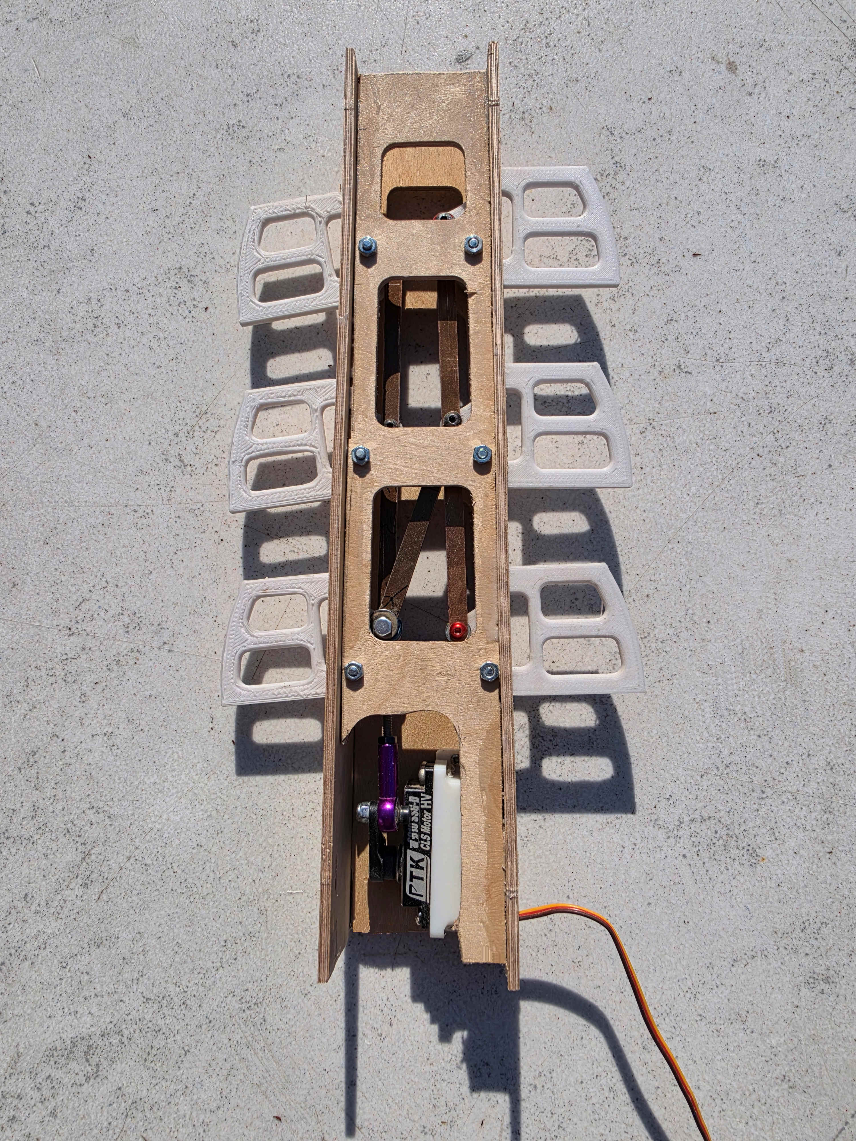 Mais le premier travail consiste à réaliser les pièces de la mécanique des aérofreins. Ils sont constitués chacun de 3 palettes pour l extrados et 3 palettes pour l intrados. Un servo équipé d un palonnier avec un débattement d environ 25 mm permet de sortir et de renter complètement les palettes. Les palettes sont réalisées a l aide d une imprimante 3D avec un PETG, les flancs a partir de ctp bouleau 30/10.
