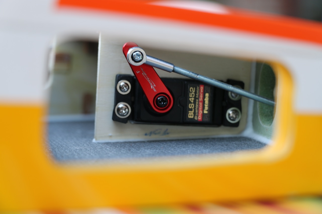 Le train avant est fixé par 4 vis et des inserts en dessous (non fournis). J'ai du légèrement agrandir la lumière qui laisse passer le corps du moteur du train car il frottait sur le couple. Le servo de direction est monté sur une platine qui pivote avec le train rentrant.