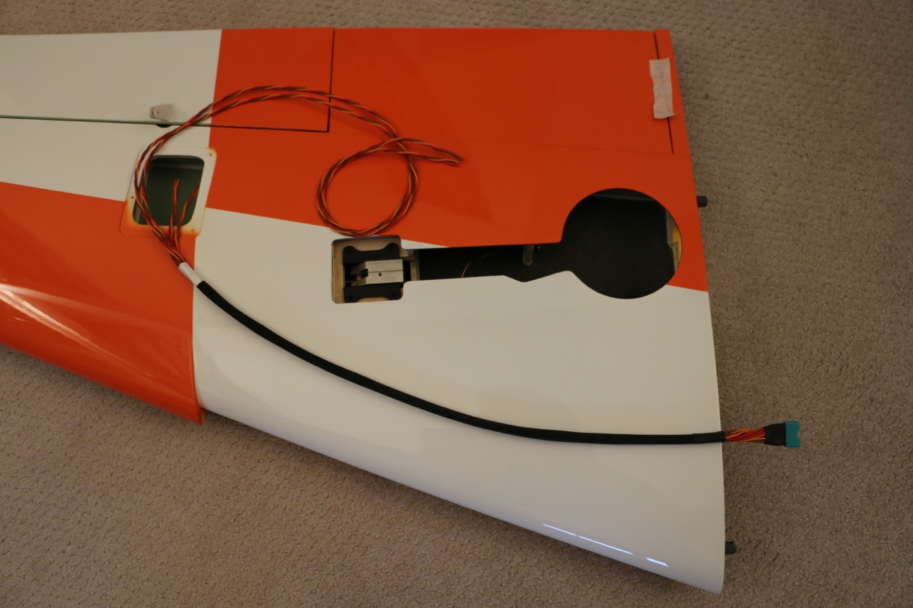Montage de l'aile, il faut prévoir de passer 4 câbles de servos par aile (aileron, flap, train et frein), j'ai utilisé des connecteurs MPX vendus pré-câblés qui supportent 4 servos. Les 2 cartes électroniques de contrôle du train rentrant et des freins sont fixés dans la trappe du servo d'aileron. Comme pour la dérive le servo d'aileron est fixé sur un support en CTP collé à la trappe. Le servo de flap est installé dans une découpe prévue dans un couple de l'aile. Le boitier de train est vissé aux inserts installés sous la platine. Pour finir, il faut coller l'apex sur l'aile juste à l'endroit du décrochement prévu sur l'aile.