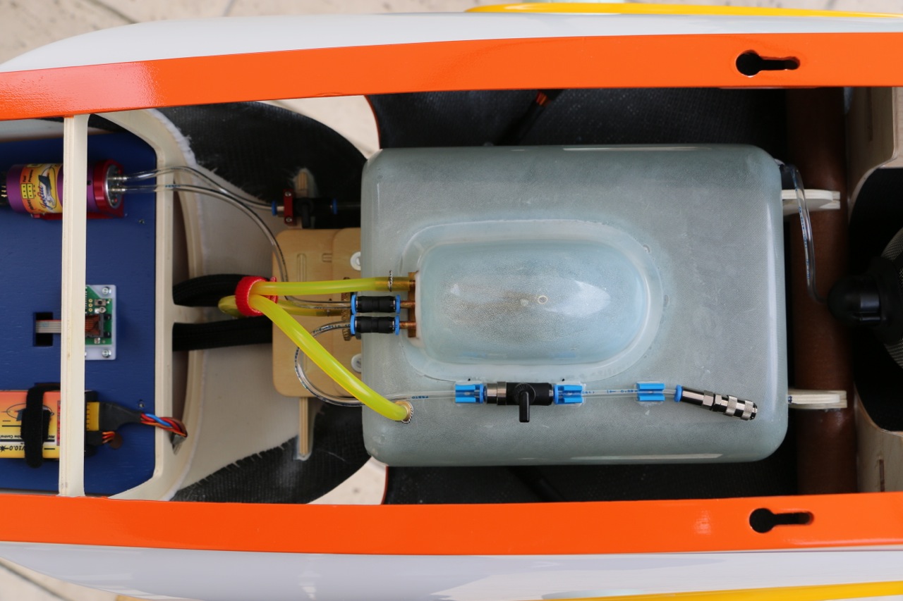 Fixation des tubulures sur le réservoir, j'ai monté le filtre JetCat en position vertical à l'arrière du réservoir juste avant la turbine. Le circuit est assez compact car la nourrice est intégrée au réservoir. Je dois encore faire le test de tout le circuit avec du carburant (mode test pump à différents régimes).