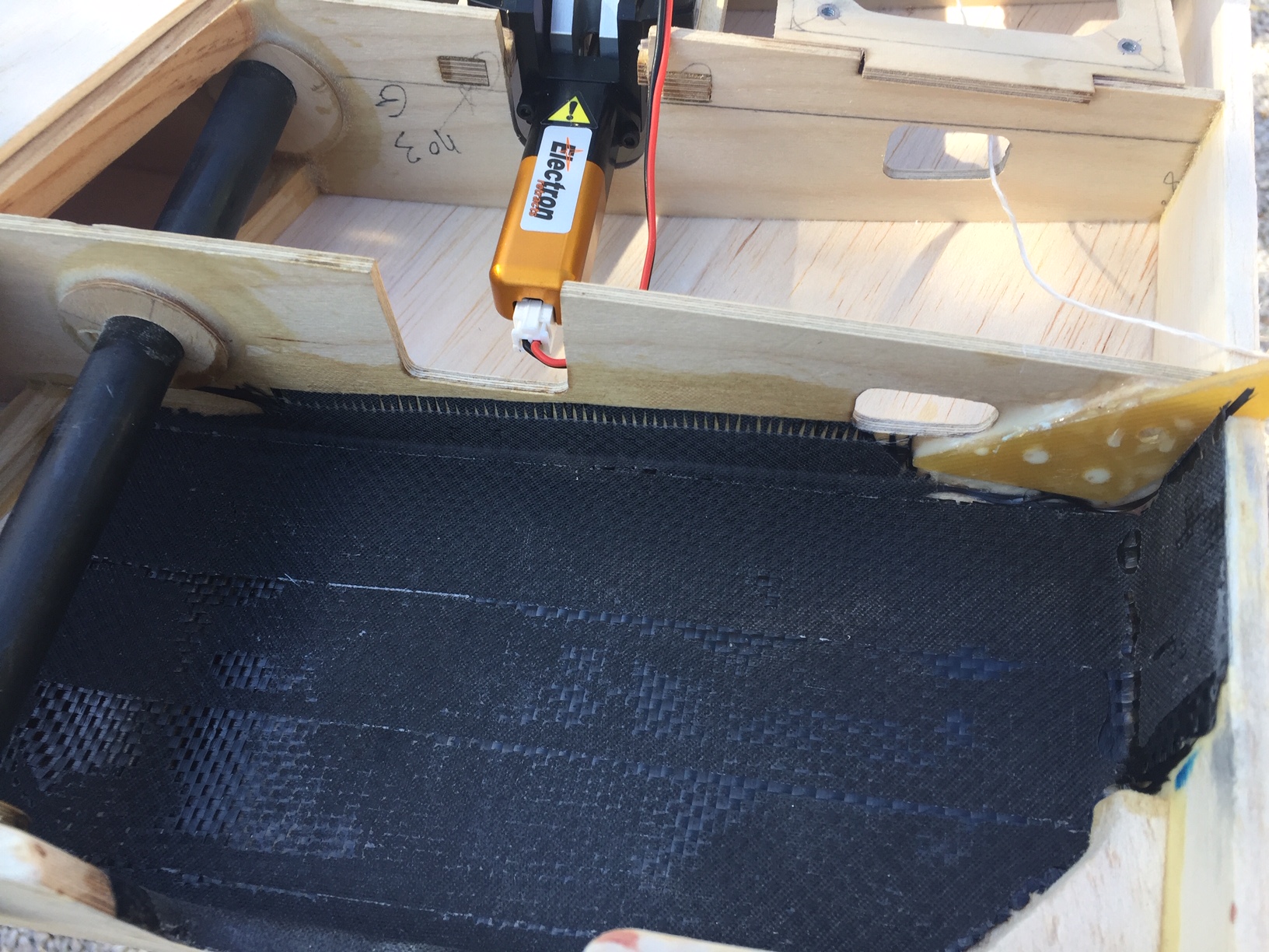 Bonjour à tous, donc aujourd hui finition du renfort en carbone j ai été un peu juste avec la resine, la fibre a bien été impregnée mais pas sufisament pour mouiller le tissu d arachage ce qui donne un etat de surface pas super regulier :( . Fixation de l aile, 2 vis M5 avec ecrou a griffe un dans le fuselage (vis arriere) et un dans la nervure (vis avant) decoupe dans le fuselage pour le passage de la roue (je ne sais pas encore si je vais boucher ce trou), et comme j y suis, pose d un joint (mastic) pour la finition entre le fuselage et l aile. Photos