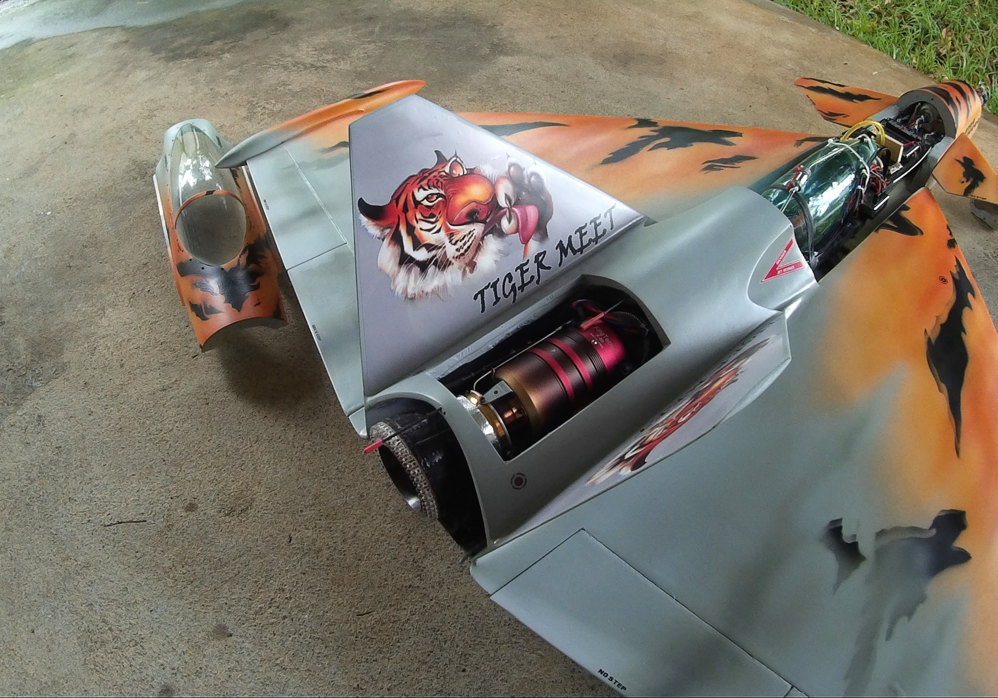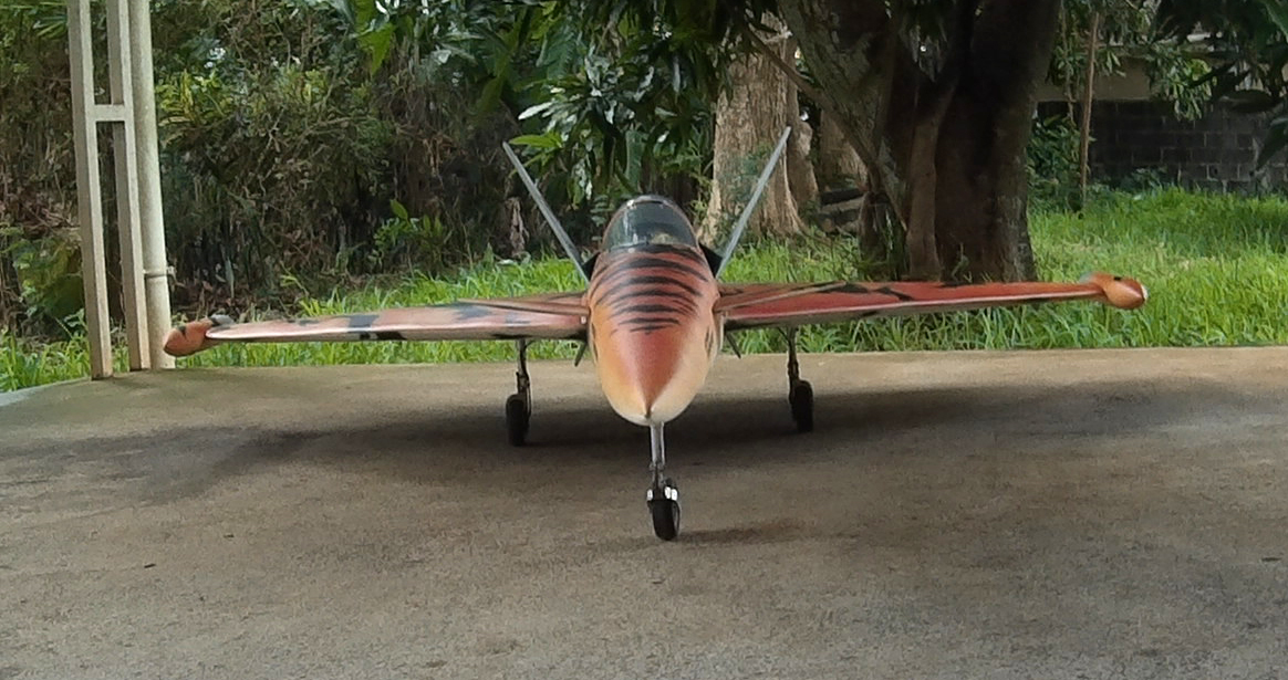 Malgré un bon vent en rafale de 25kmh, le volatil c´est montré stable. Faut juste diminuer les débattements aux ailerons. J´ai du donner 3 crans de trim a la profondeur, 2 aux ailerons et 2 a la pipe vectorielle pour que l´oiseau file droit. La présence en vol est belle. Avec ses 9kg pour une poussée de 6 kg c´est pas un foudre de guerre, cependant le vol est réaliste. La finesse est étonnante pour un Delta. Aucun flutage n´est venu ternir ces premiers vols, même a pleine puissance en palier. En virage, il a tendance a engager, un peu comme le Scorpion. J´ai pas encore vraiment eu le temps tester la poussée vectorielle mais le peu que j´en ai vu est de bonne augure. Seul gros bémol, l´autonomie