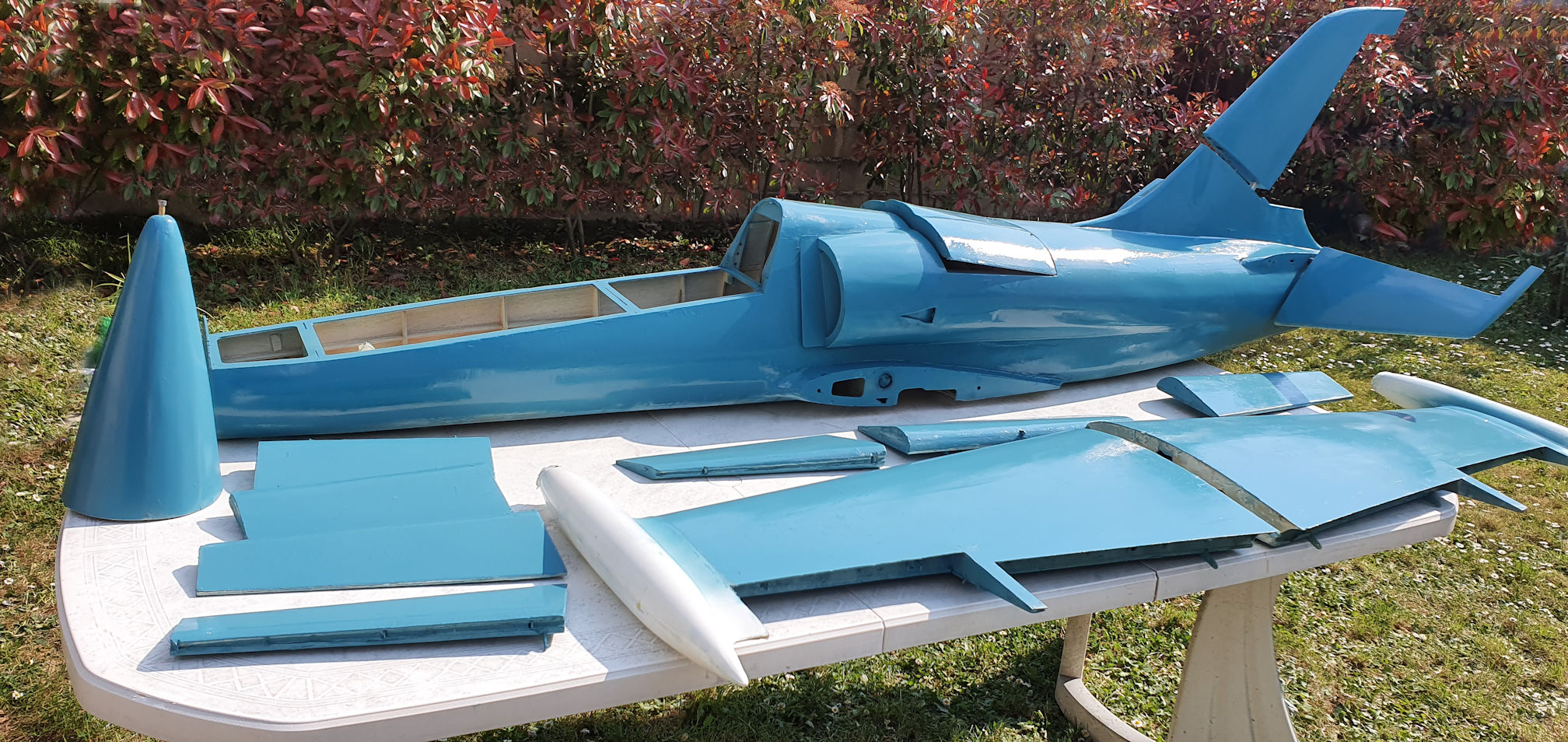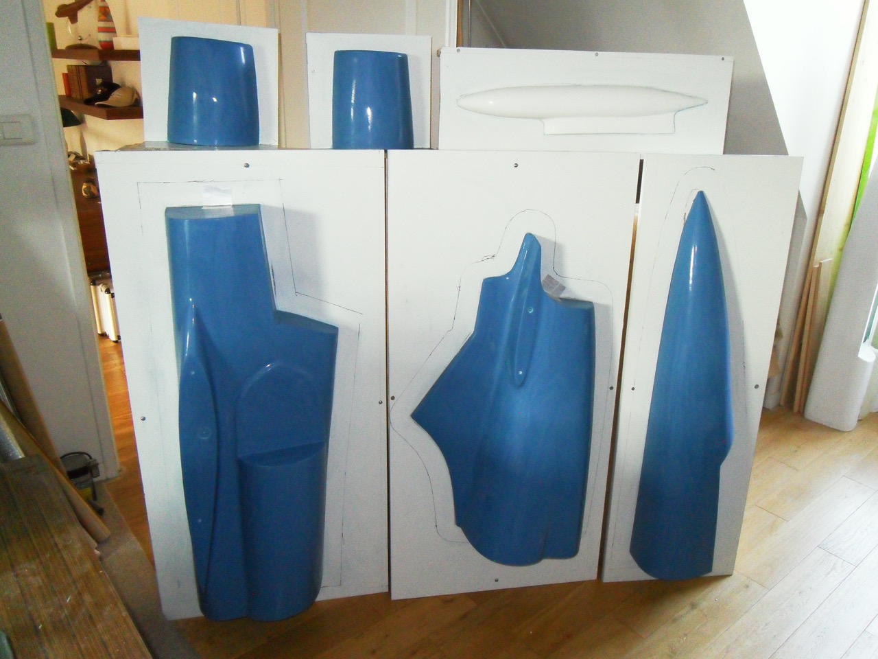 Après 5 mois ci joint, le travail de Jean pierre, en bleu le master du fuselage réalisé en trois tronçons et les premiers moules.