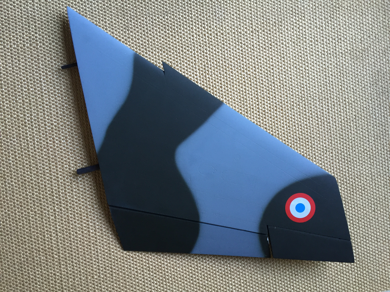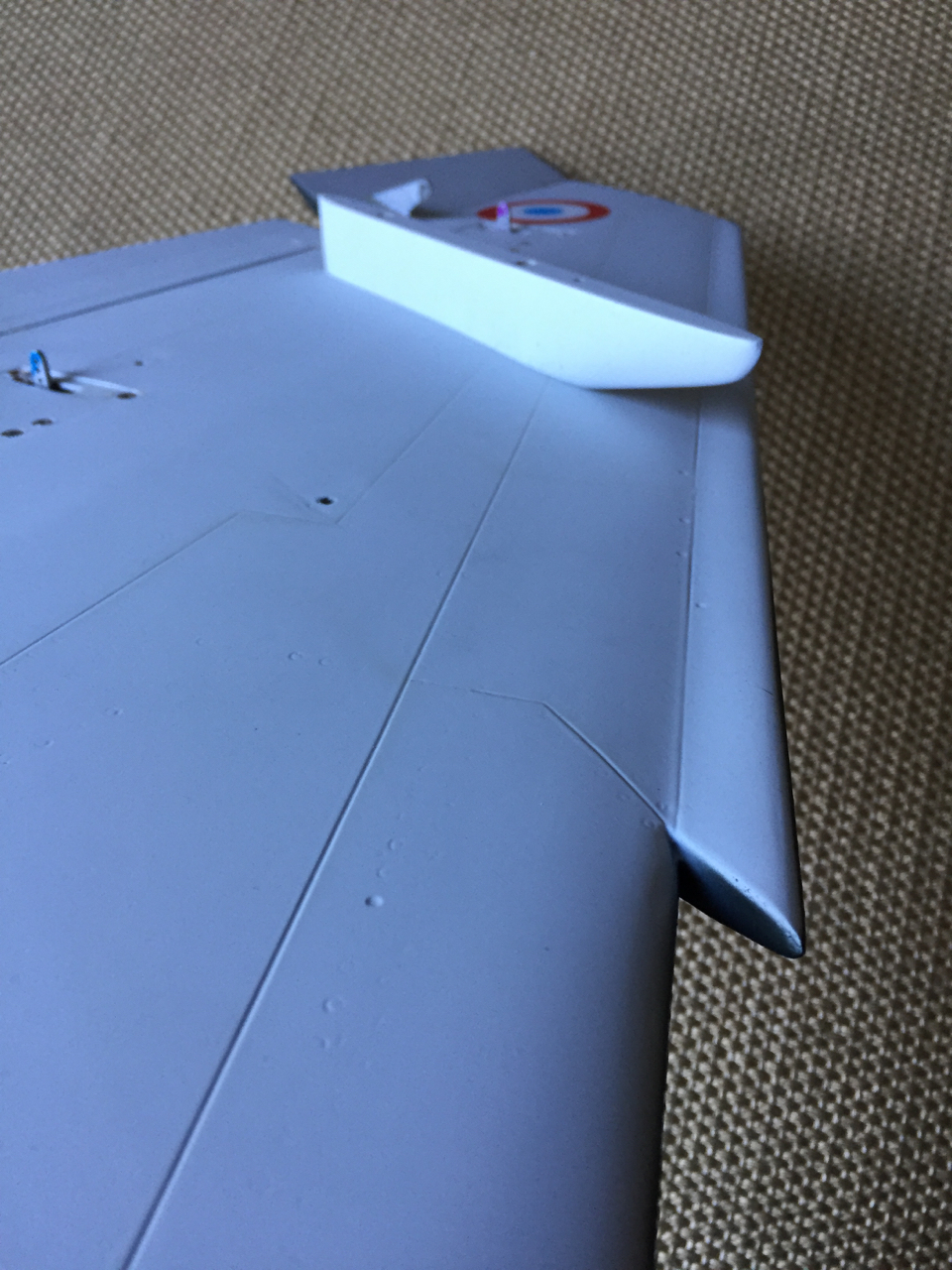 On peut noter le profil plongeant du bord d'attaque à partir de la cassure au 2/3 de l'aile. Quelques ajustements sur l'extérieur d'un des volets qui frottait sur le fuselage lors de son déploiement puis j'ai également comblé un écart trop important à mon goût entre le volet et l'aileron en collant une fine épaisseur de balsa sur l'emplanture de l'aileron. Encore quelques retouches de peinture à prévoir puis les finitions avec les marquages et transferts.