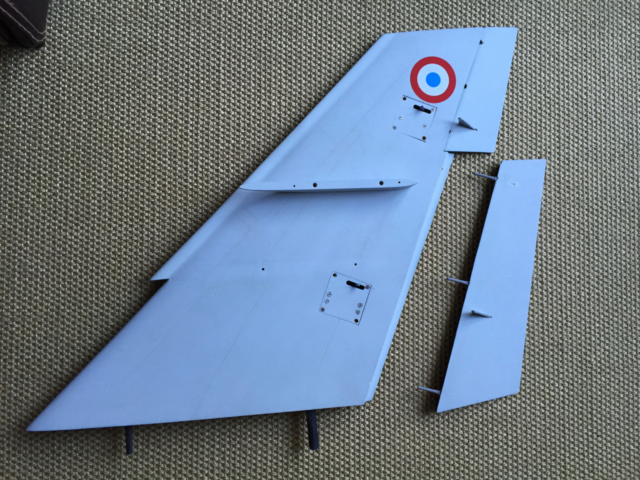 J'ai attaqué la revue des ailes. Après pas mal d'hésitation, j'ai finalement décidé de décoller un des volets car celui-ci n'était pas bien aligné avec le profil de l'aile. Pas mal de boulot à la Dremel pour extraire les charnières Robart :( Le volet et ses nouvelles charnières sont collés à la Hysol. J'en ai profité pour vérifier la fixation des guignols, pas de problème car il y a bien de la matière autour et le collage est solide.
