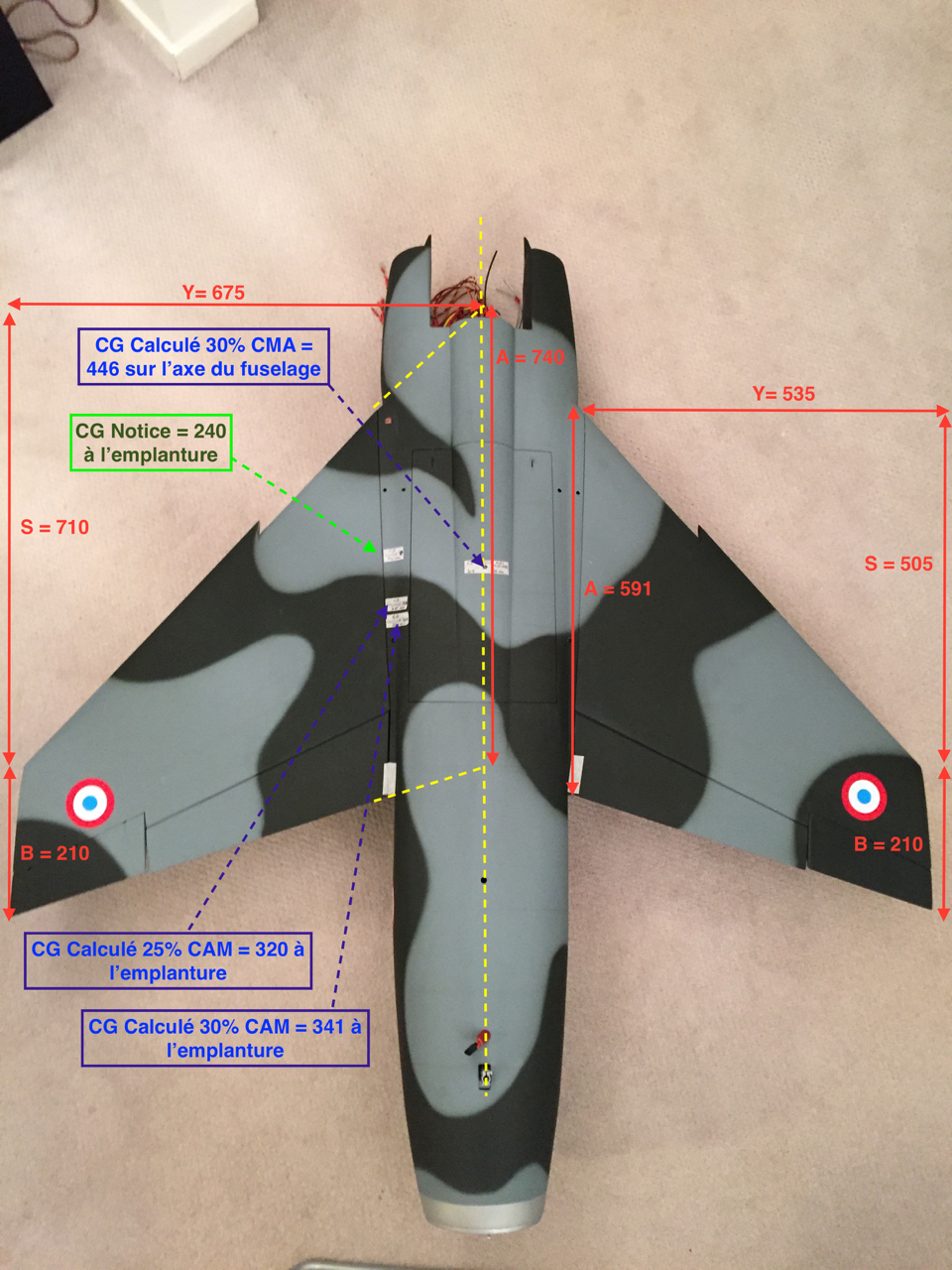 Merci Gaëtan pour la vérification, cette hypothèse de calcul a été aussi confirmée par René Lempereur qui a validé en vol un Mirage F1 (construction tout bois) et qui a utilisé la surface depuis l'axe du fuselage au saumon avec un CG calculé à 27% de la corde moyenne. Je vais donc partir sur ce calcul pour le 1er vol. Les calculs basés sur la surface de l'aile seule donne un CG très arrière de visu.