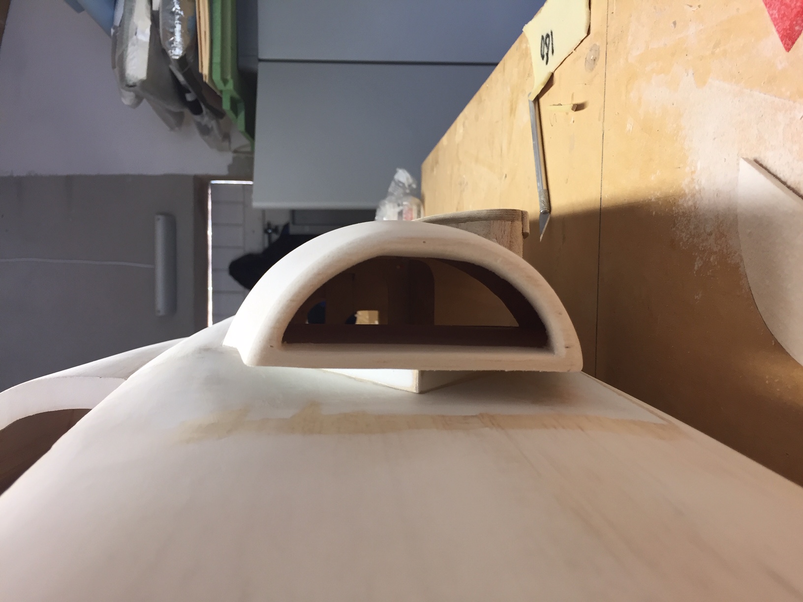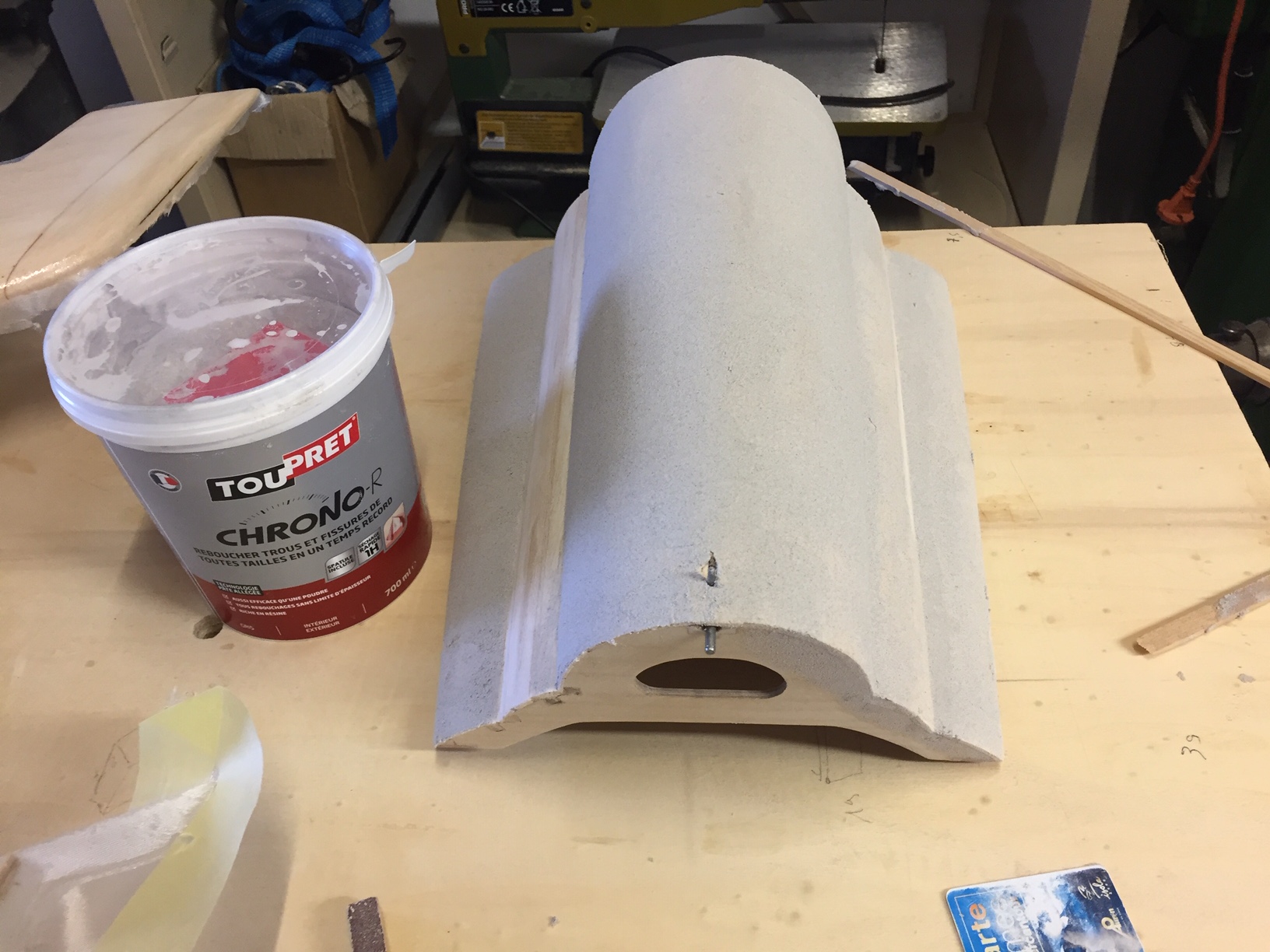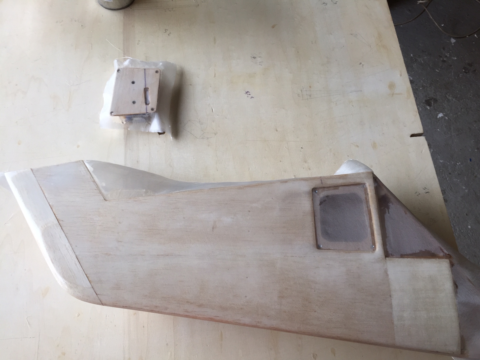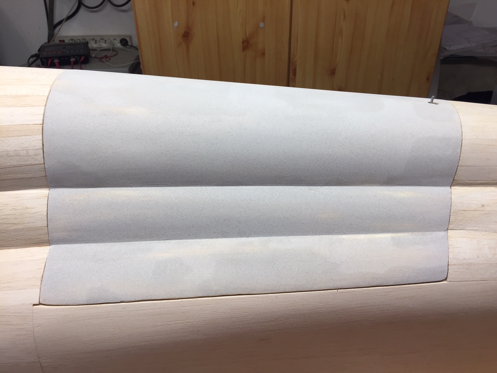 Apres plusieurs magasins impossible de trouver le mastic polyfilla donc commandé sur le net et reception fin de semaine si tout va bien. En attendant j ai mastiqué tout le capot avec mon premier pot, et bonne surprise ca se ponce plutôt bien et durcit considerablement la surface (j ai meme pensé a aprêter directement sans passer par la case fibrage), je peut travailler facilement les arretes et les formes arrondies. J ai fini le fibrage de la derive et le poncage de la gouverne, reste le poncage de la derive (fixe). Photos