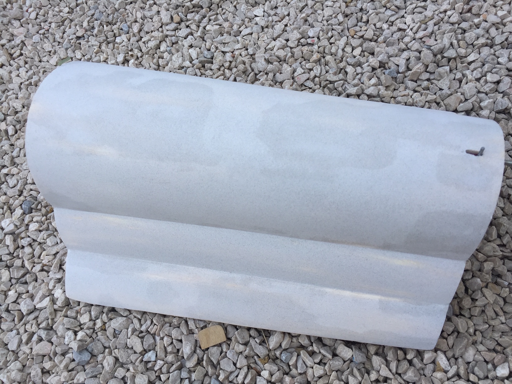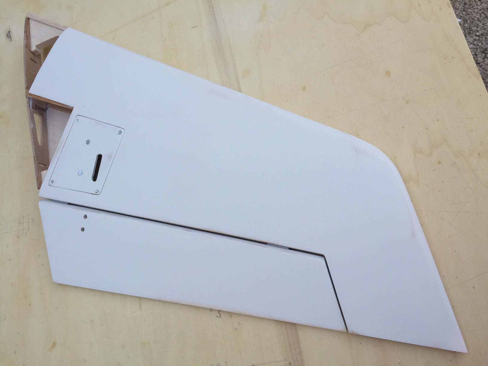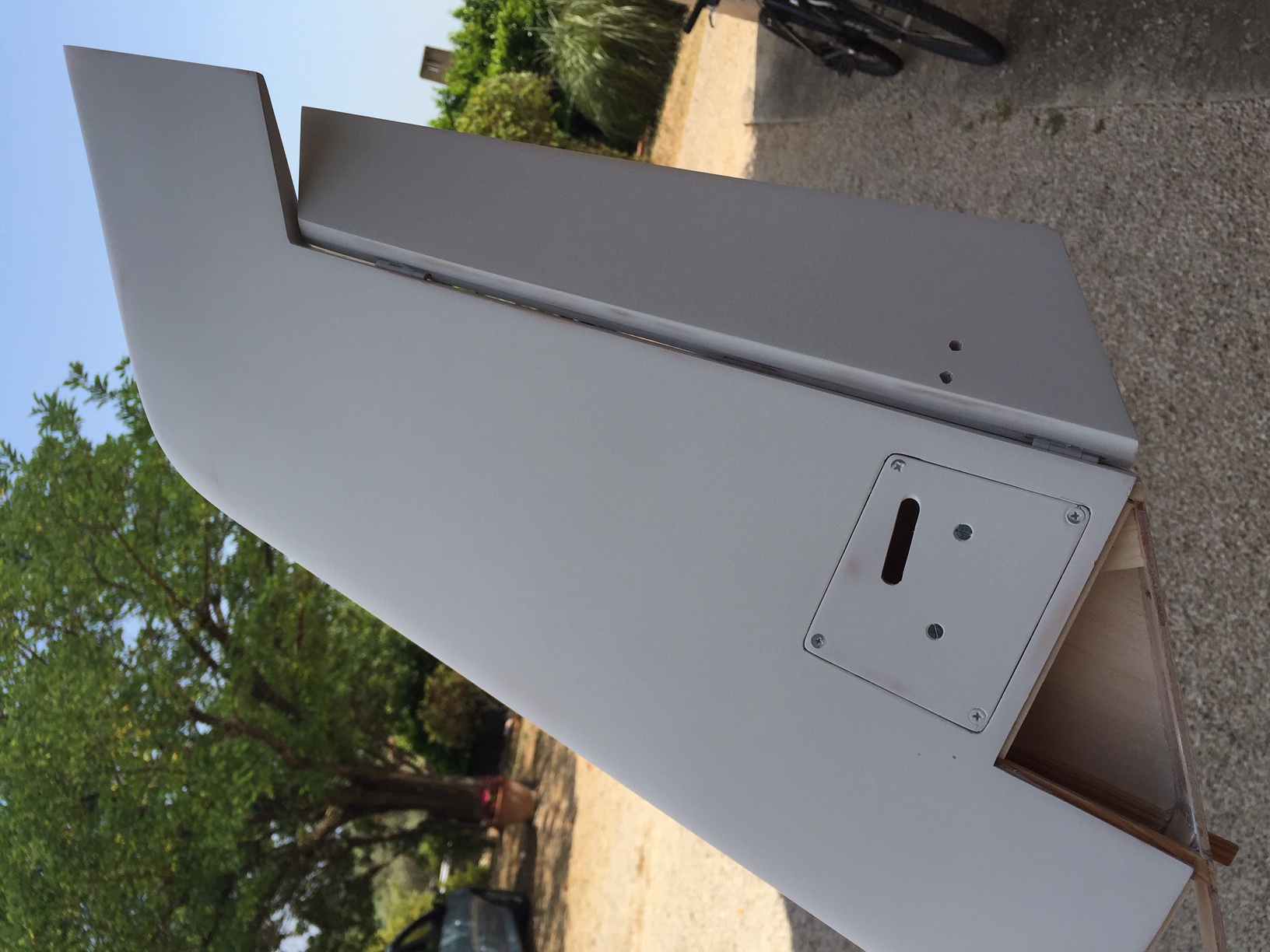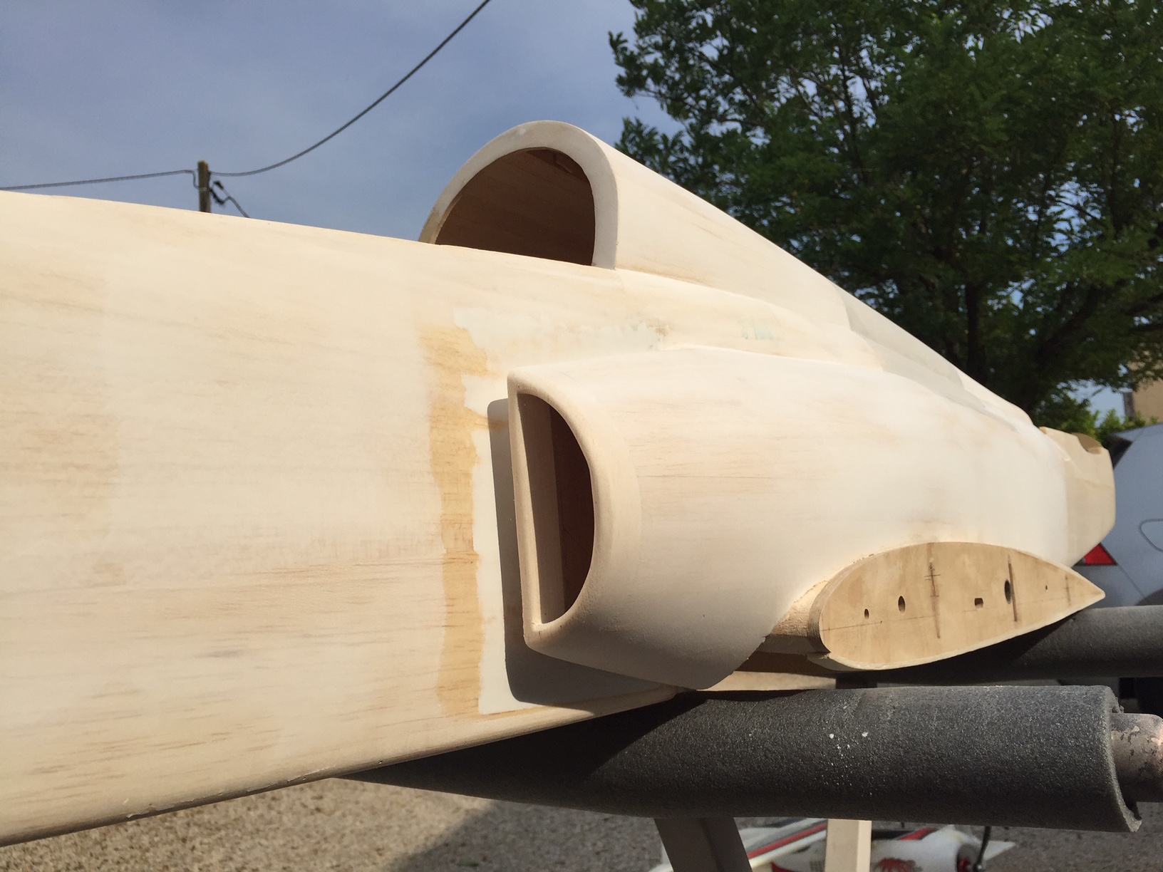 Apres plusieurs magasins impossible de trouver le mastic polyfilla donc commandé sur le net et reception fin de semaine si tout va bien. En attendant j ai mastiqué tout le capot avec mon premier pot, et bonne surprise ca se ponce plutôt bien et durcit considerablement la surface (j ai meme pensé a aprêter directement sans passer par la case fibrage), je peut travailler facilement les arretes et les formes arrondies. J ai fini le fibrage de la derive et le poncage de la gouverne, reste le poncage de la derive (fixe). Photos