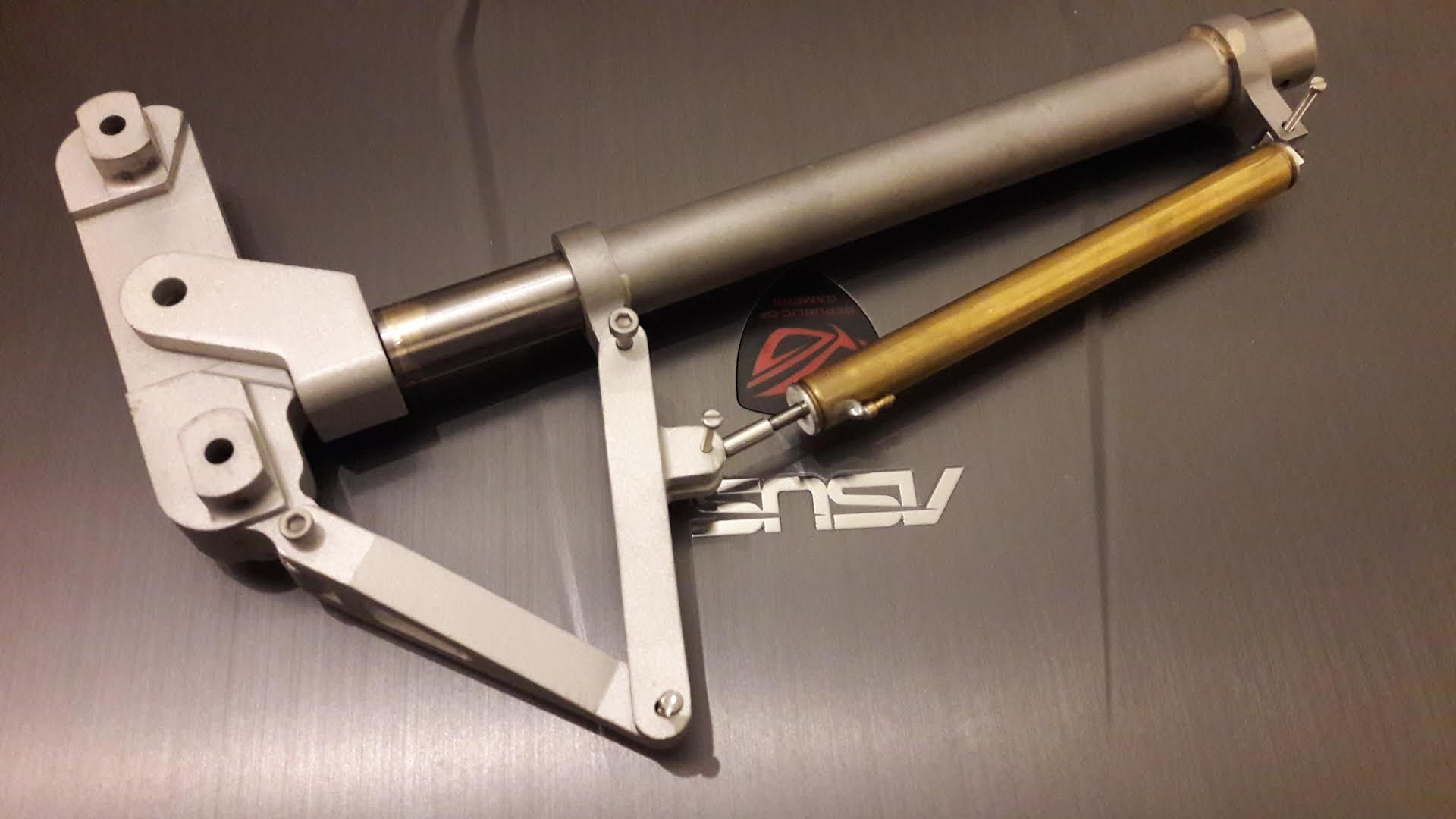 Suite à la question posée, le train étant un pré-requis à tout projet, je l'avais fait réaliser en amont. Celui du réel est d'une telle complexité avec des éléments en poutrelles type tour Eifel que j'ai pris quelques libertés :4 roues par bogie au lieu de 8 et des jambes d'une seule piece... Les vraies se plient comme un genou tandis que la bogie pivote a plat pour loger dans l'aile. Sur la version simplifiée le vérin a gaz la fait également pivoter, quand aux boîtiers ils sont électriques, version grand modèle de chez Eurokit (Carreli Retracts) .
